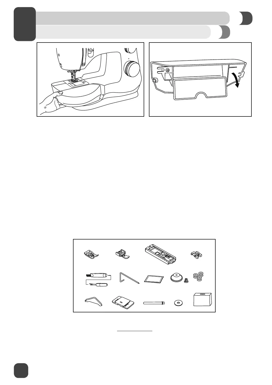 La machine est fournie avec des pieds presseurs et des accessoires standards.