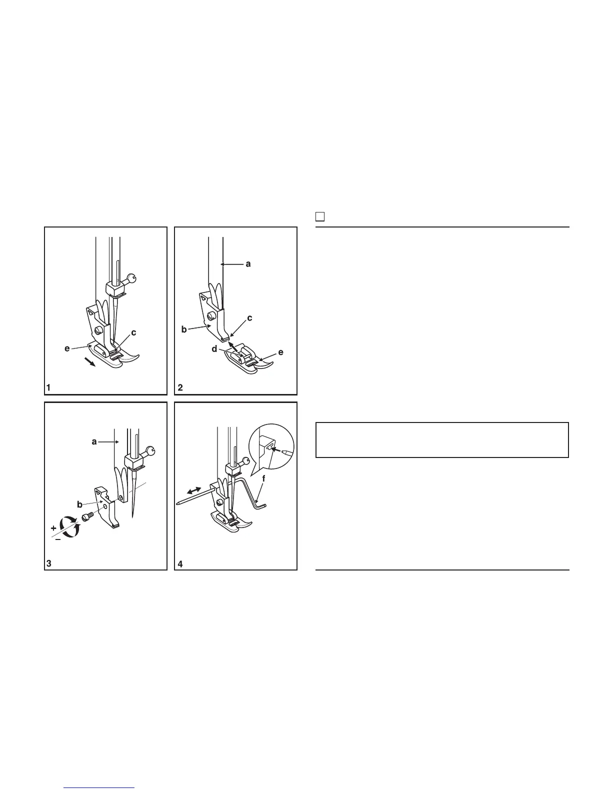Push the presser foot (e) to disengage from the cut-out (c). (1)
