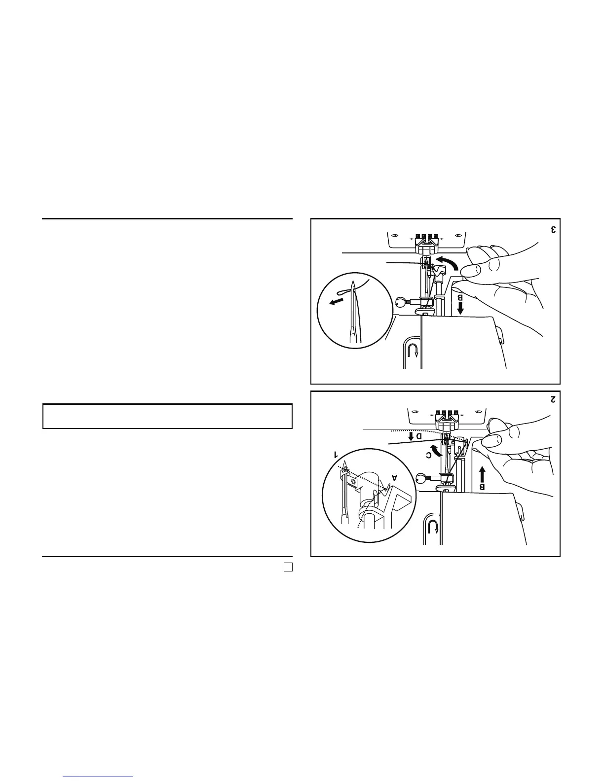 - Masukkan benang di depan jarum di sekeliling pengait (D)