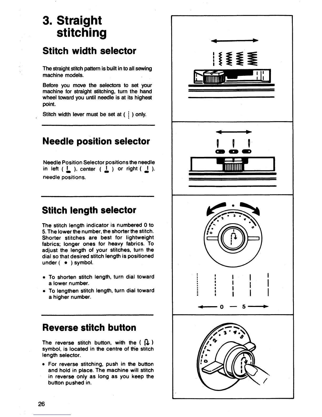 Singer 3343 - Straight Stitching; Stitch Width Selector; Needle Position Selector; Stitch Length Selector