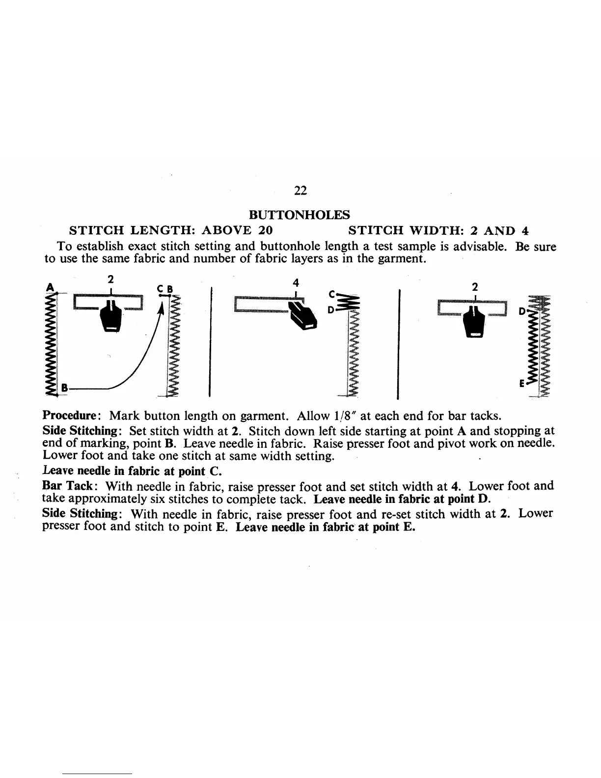 To establish exact stitch setting and buttonhole length a test sample is advisable. Be sure