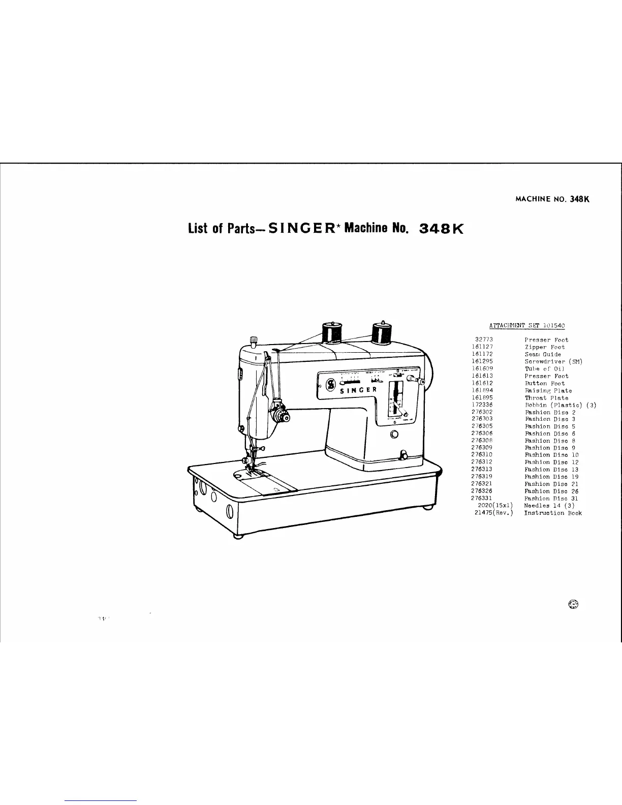 Singer 348K - List of Parts; Attachment Set Parts