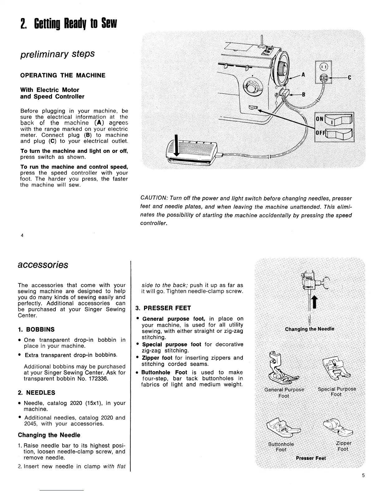 Singer 360 - 2. Getting Ready to Sew; Preliminary Steps; Operating the Machine; Accessories