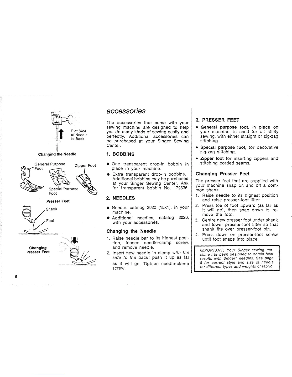 Singer 362 - Bobbins; Needles; Presser Feet; Changing the Needles;Presser Feet