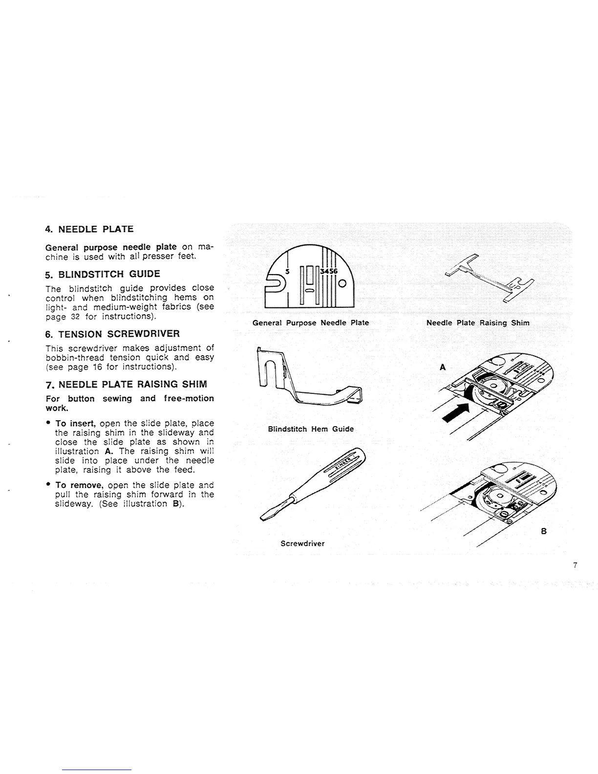 Singer 362 - Needle Plate; Blindstitch Guide; Tension Screwdriver; Needle Plate Raising Shim