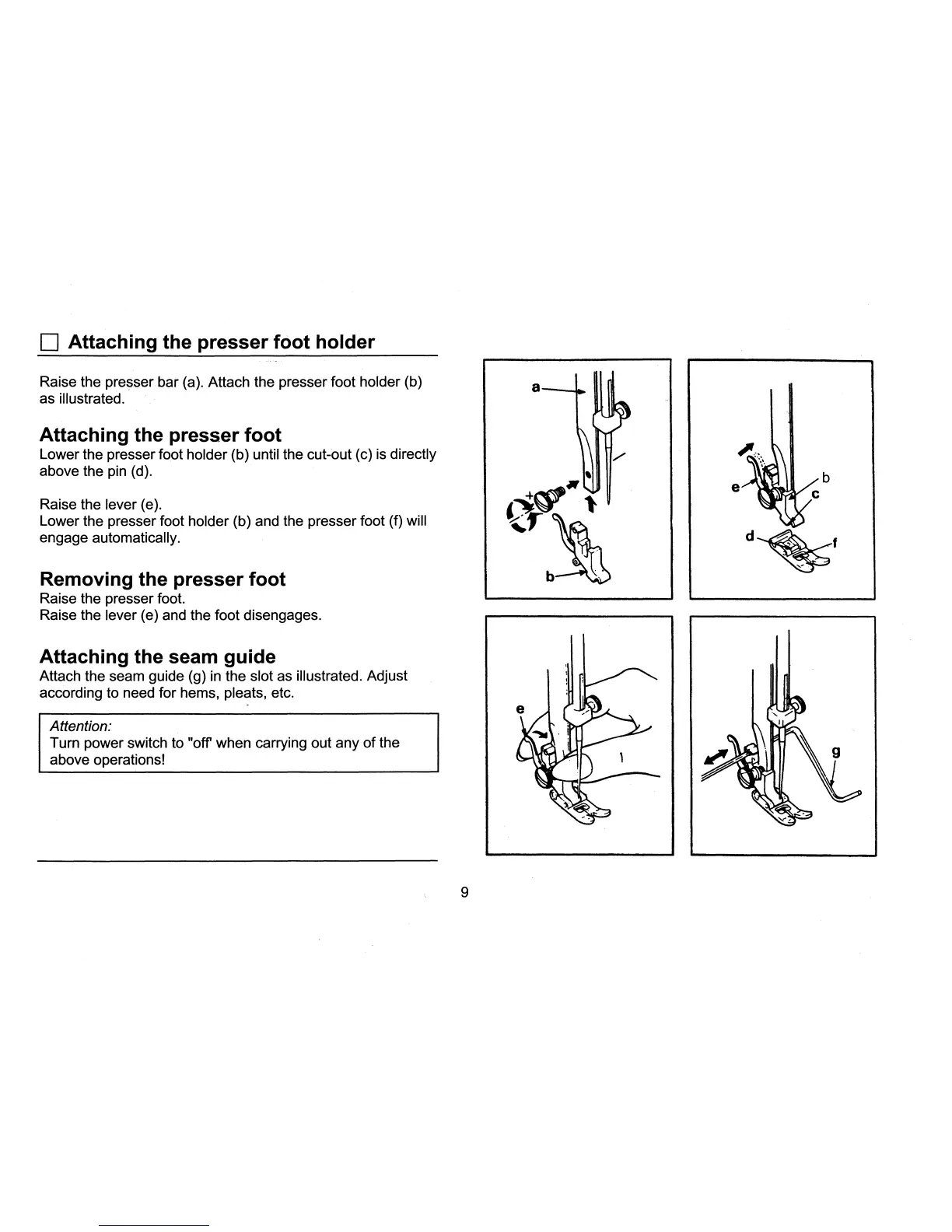 Singer 3709 - Presser Foot and Seam Guide Installation; Attaching Presser Foot Components; Attaching the Seam Guide; Safety Reminder