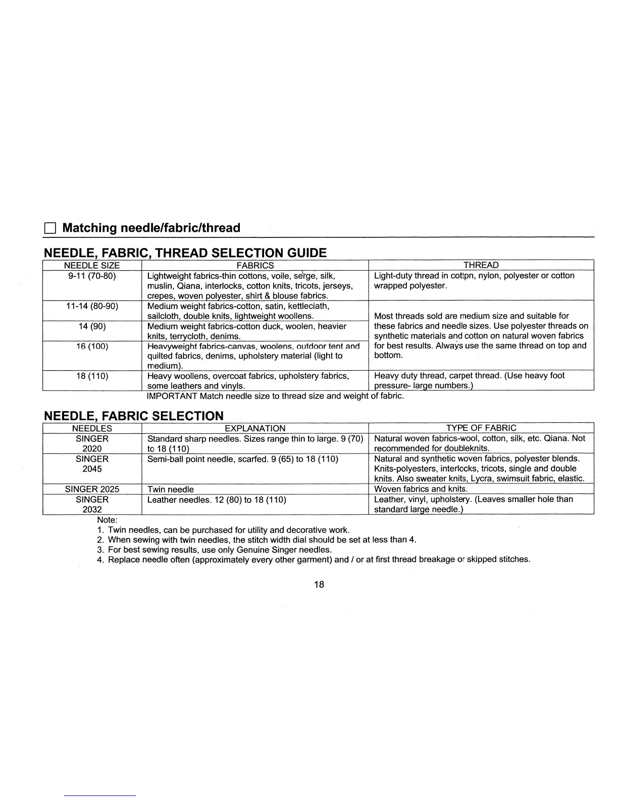 Singer 3709 - Needle, Fabric, and Thread Selection; Selection Guide and Notes; Needle Types and Compatibility