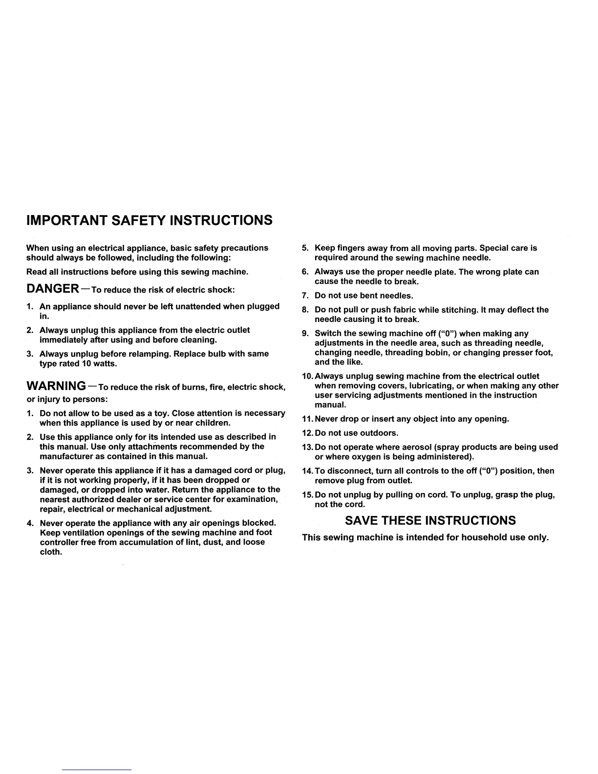 Singer 3722 - Important Safety Instructions; DANGER - Reduce Electric Shock Risk; WARNING - Prevent Injury and Fire; Save These Instructions