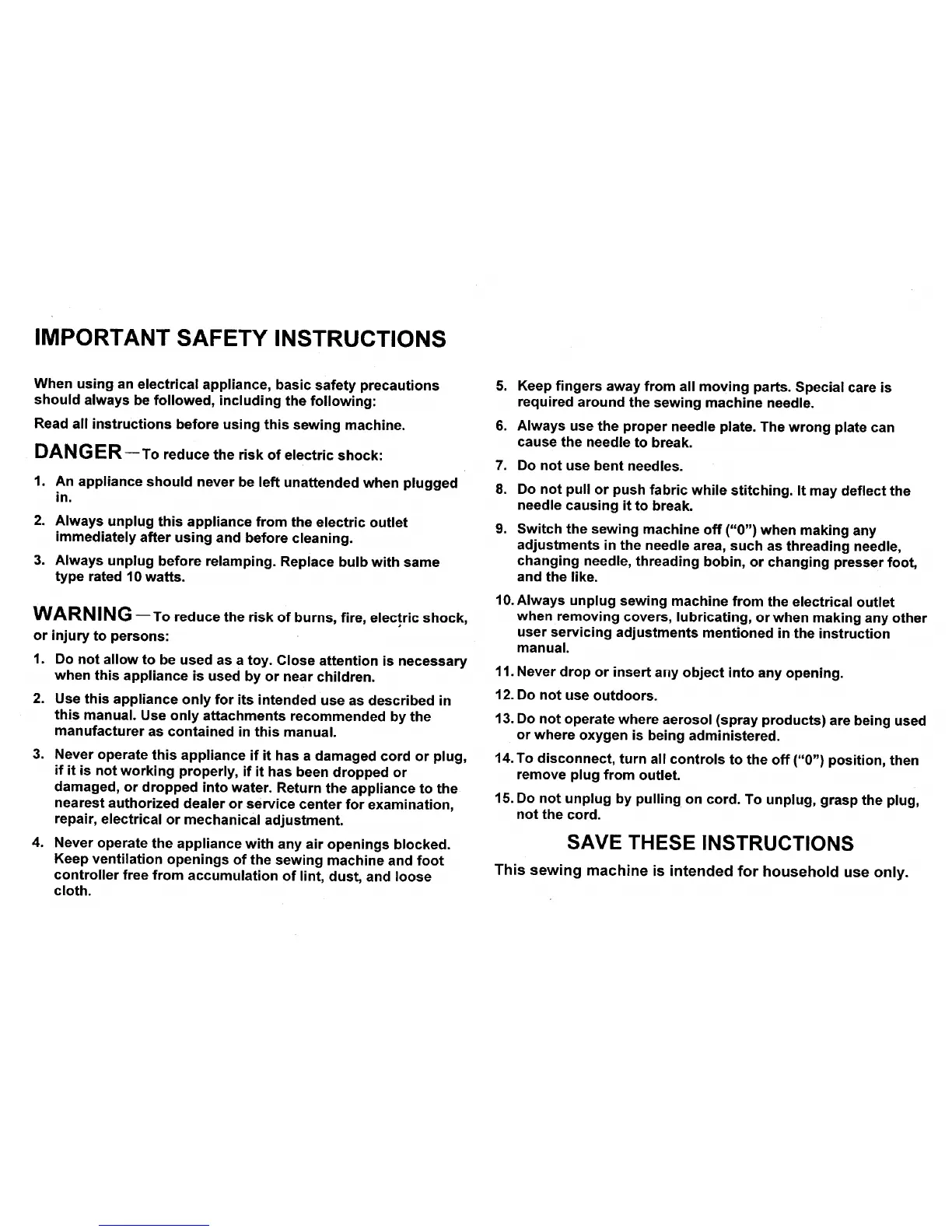 10. Always unplug sewing machine from the electrical outlet