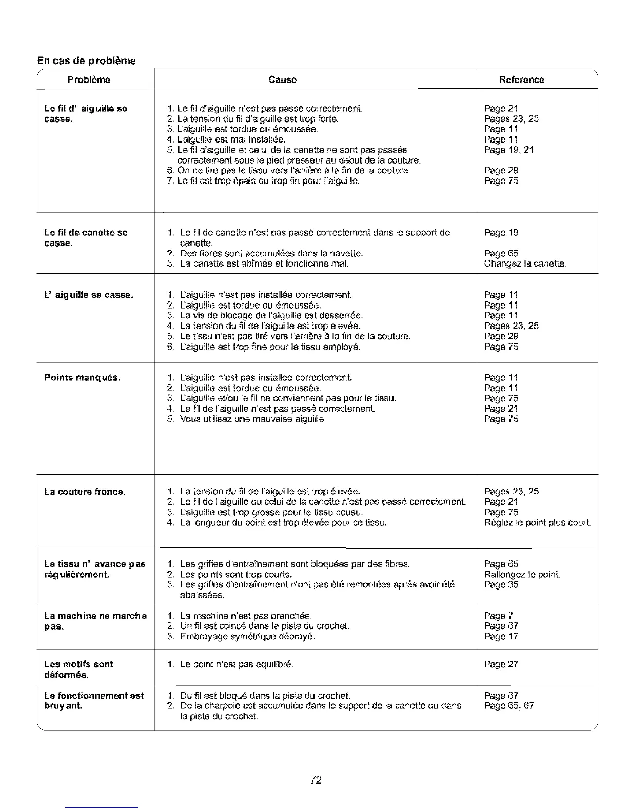 3. L'aiguille est trep grosse pour le tissu cousu. Page 75