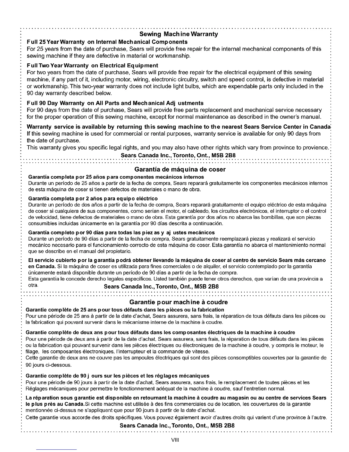 Warranty service is available by returning th is sewing machine to the nearest Sears Service Center in Canada: