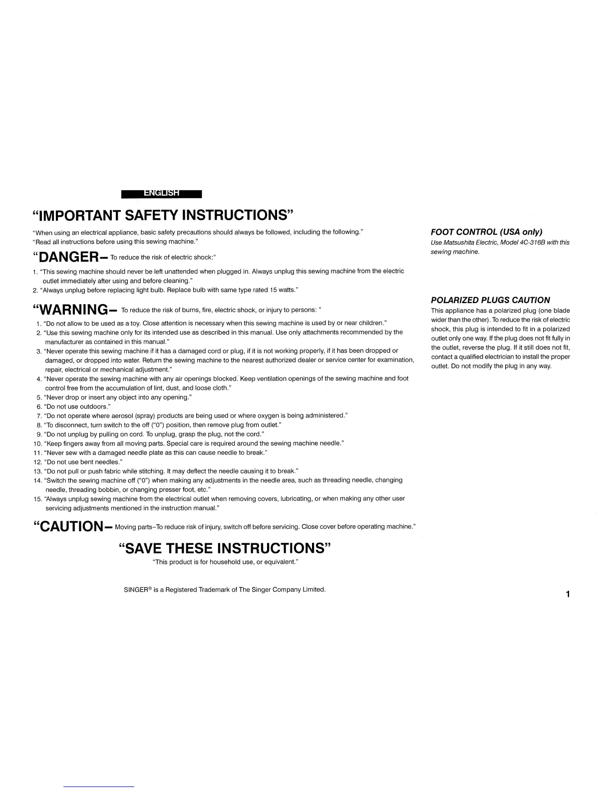 Singer 3962 - Essential Sewing Machine Safety Instructions; Danger: Reducing Electric Shock Risk; Warning: Preventing Burns, Fire, and Injury; Caution: Protecting Against Moving Parts