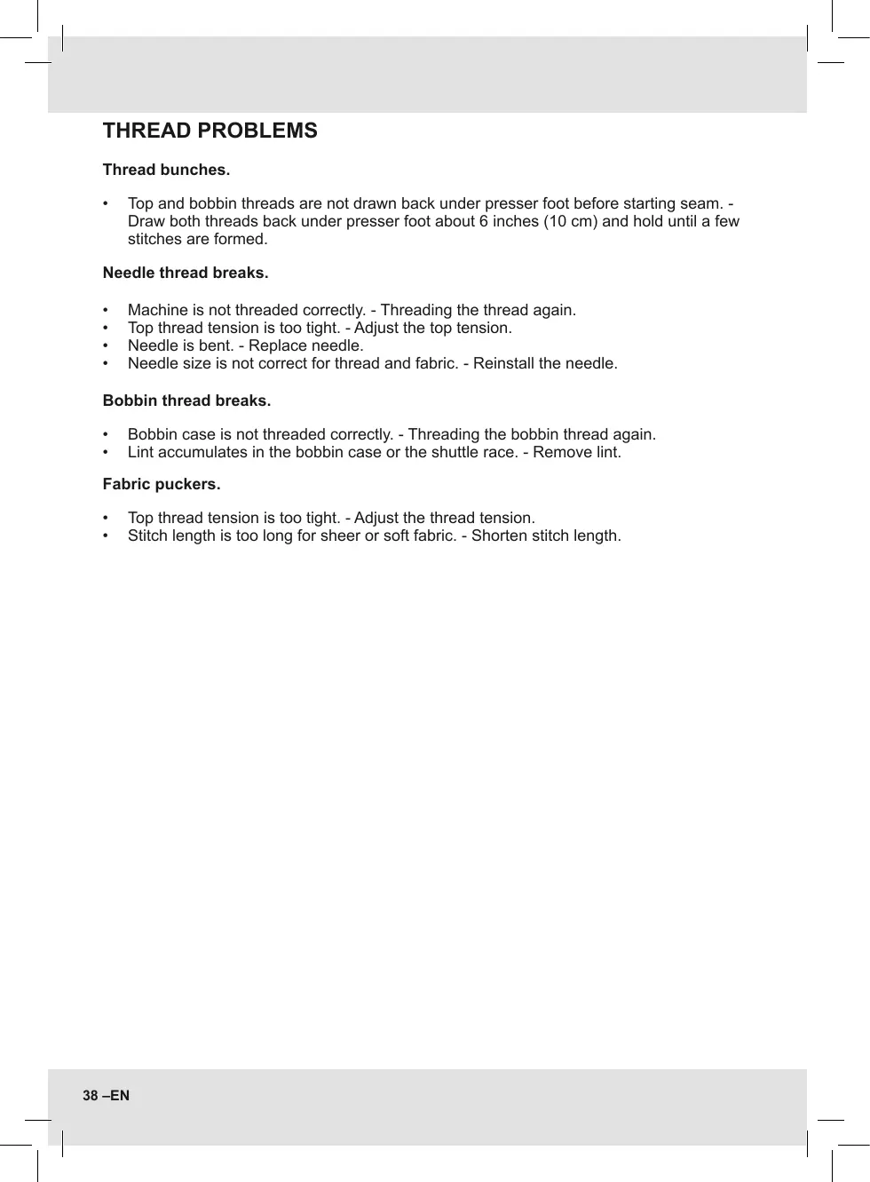 • Lint accumulates in the bobbin case or the shuttle race. - Remove lint.