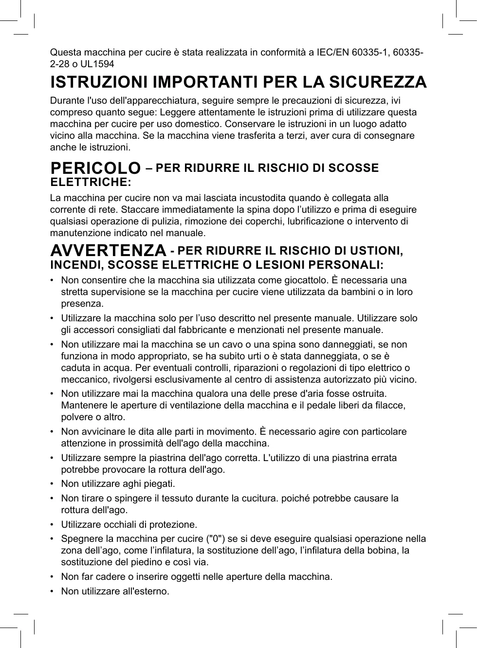 Questa macchina per cucire è stata realizzata in conformità a IEC/EN 60335-1, 60335-