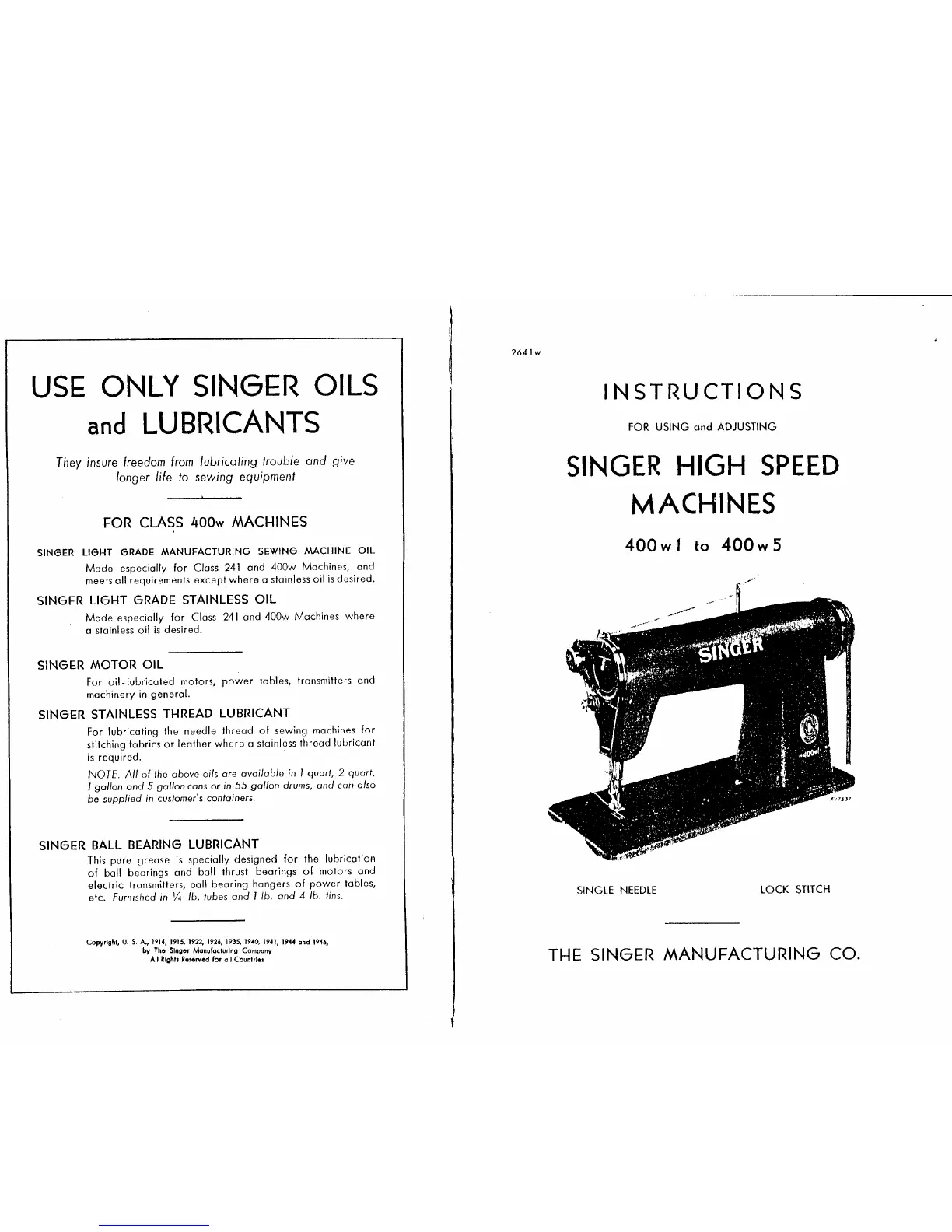 Singer 400W1 - Singer High Speed Machine Instructions; Oils and Lubricants for Machines; Machine Model Specifications