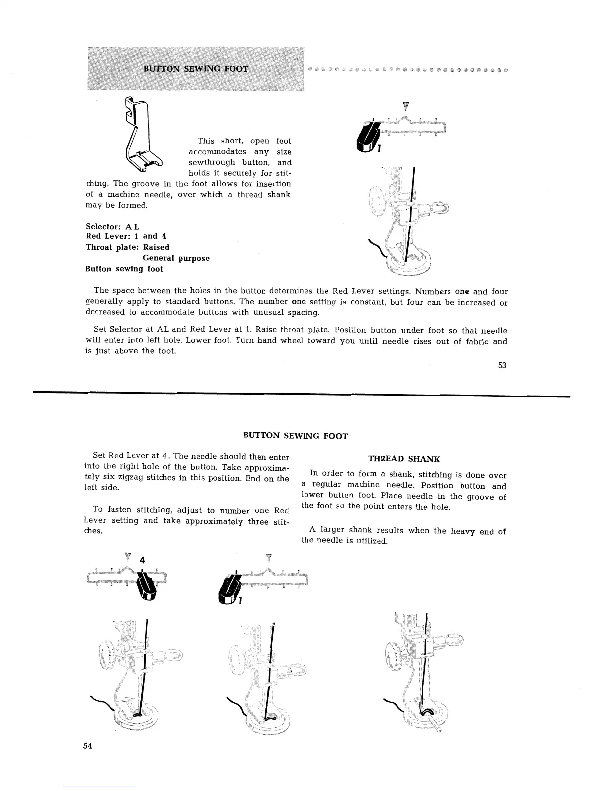 Singer 401 - Button Sewing Foot and Applications; Button Sewing Foot Usage; Button Sewing and Shank Creation; Securing Buttons and Forming Thread Shanks