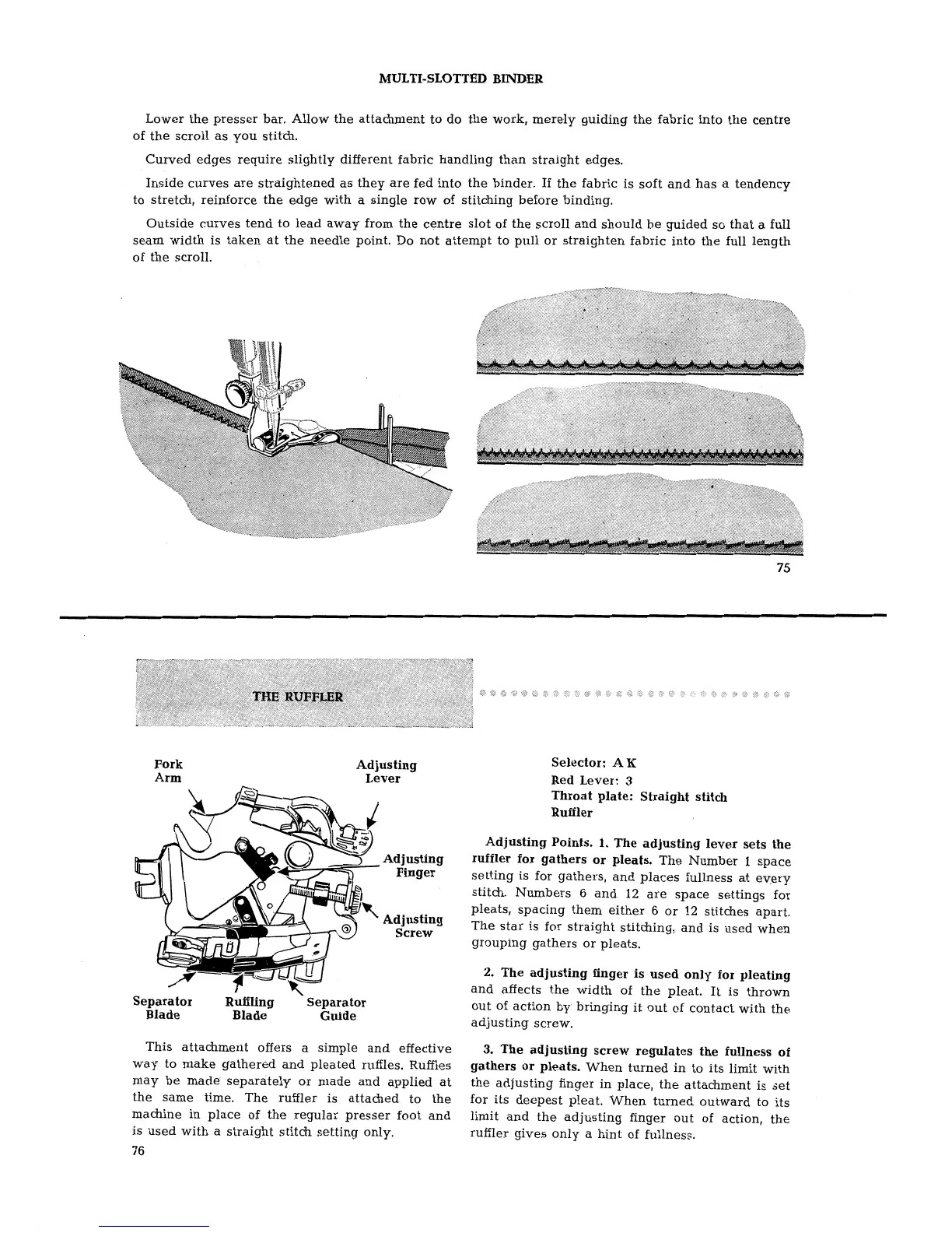 Singer 401 - Ruffler Attachment Guide; Ruffler Adjusting Points for Gathers;Pleats