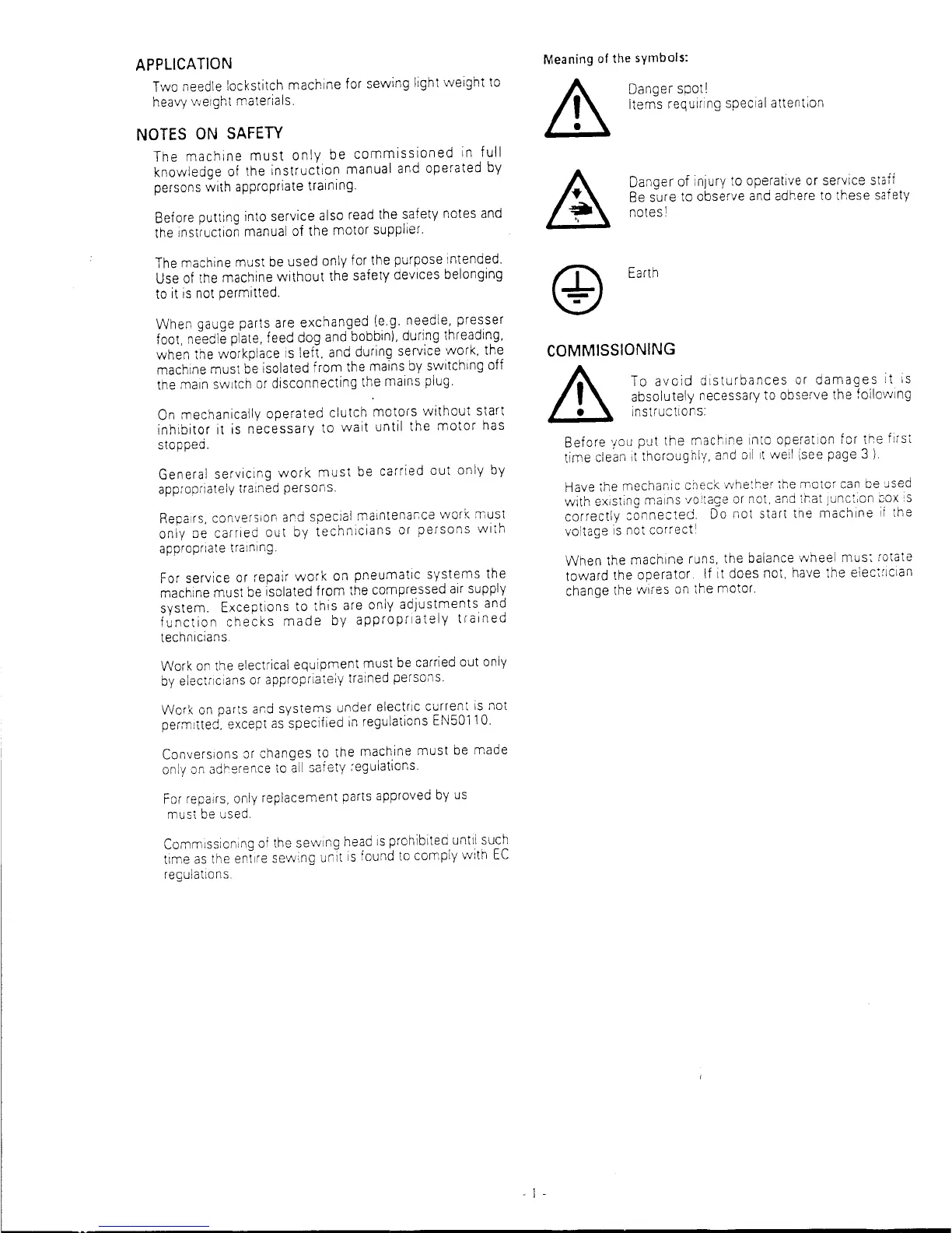 Singer 412U - NOTES ON SAFETY; Meaning of the symbols; COMMISSIONING