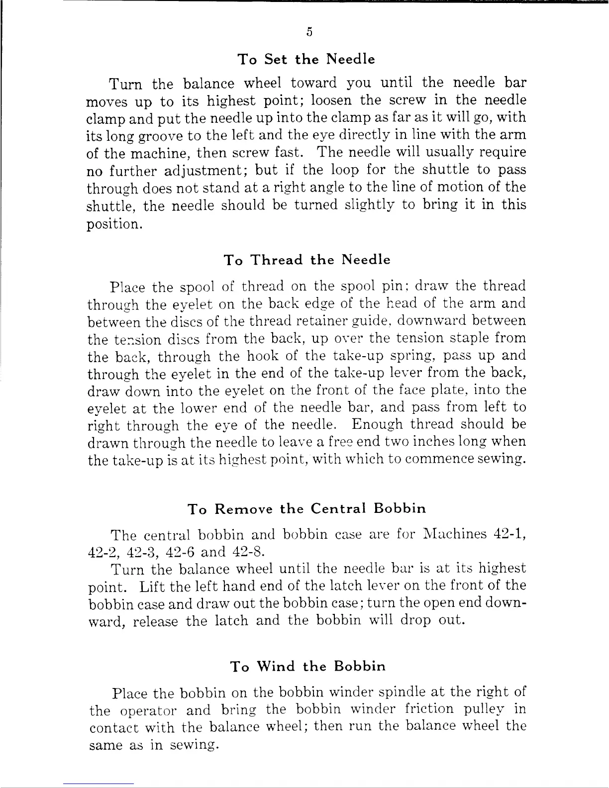Singer 42 - Core Sewing Operations; Setting the Needle; Threading the Needle; Central Bobbin Operations