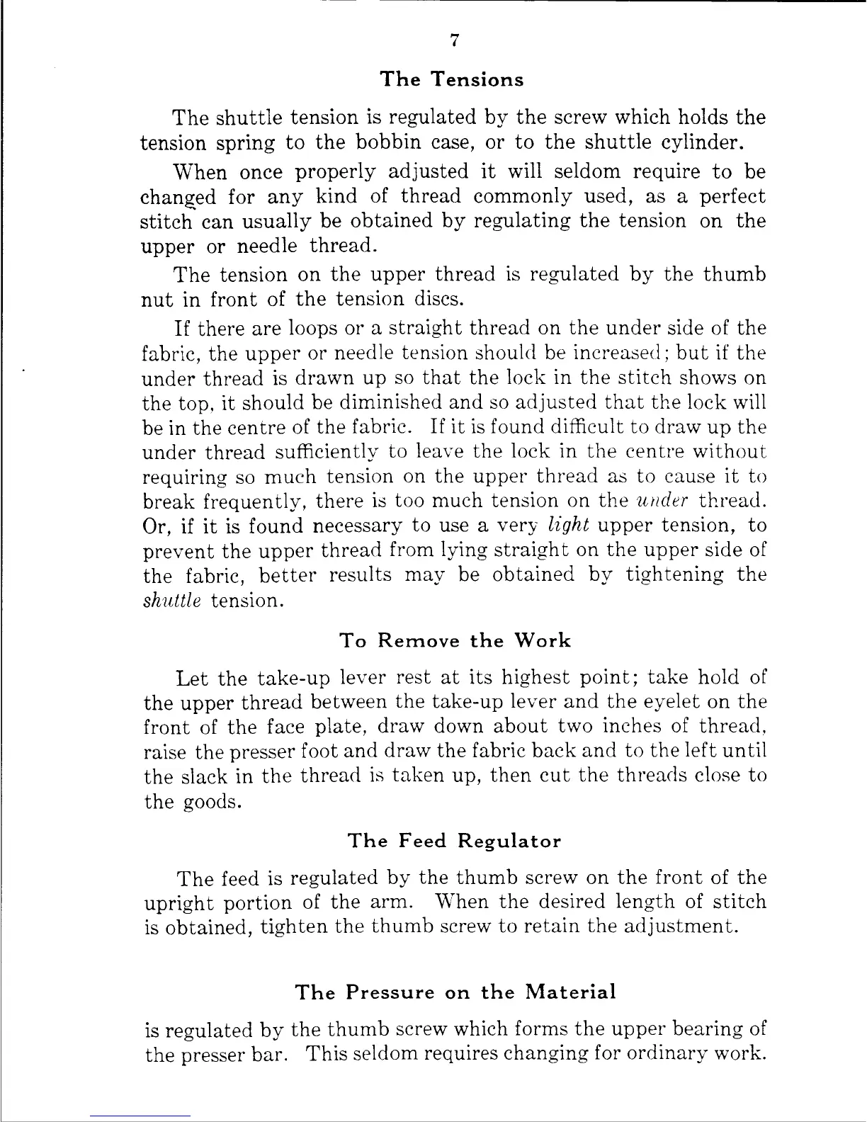 Singer 42 - Tension Adjustments and Work Handling; Regulating Tensions; Removing the Work; Feed and Pressure Adjustments
