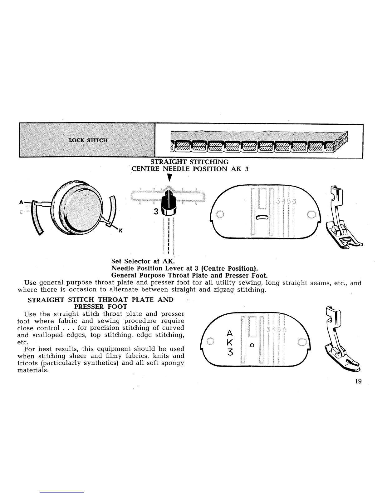 Singer 431 CONVERTIBLE - Straight Stitching; Centre Needle Position AK 3; Straight Stitch Throat Plate and Presser Foot