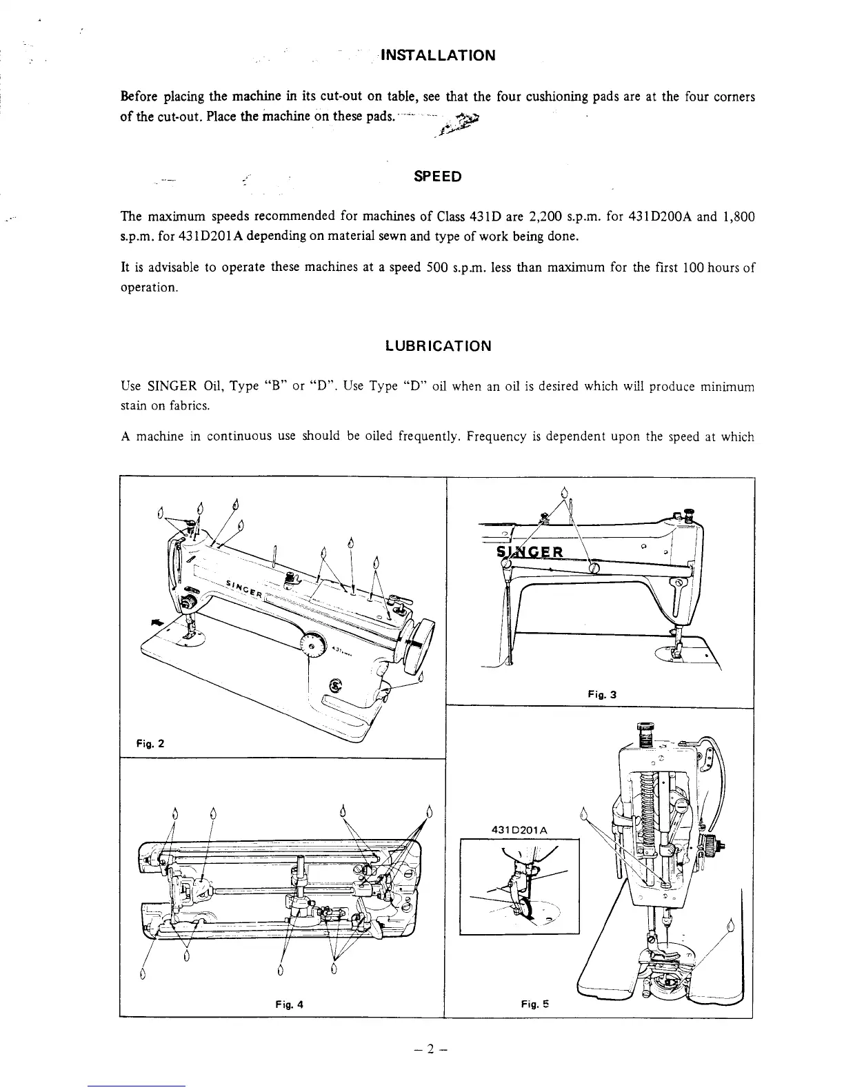 Singer 431D200A - Installation and Setup; Installation Procedure; Recommended Operating Speed; Lubrication Guidelines
