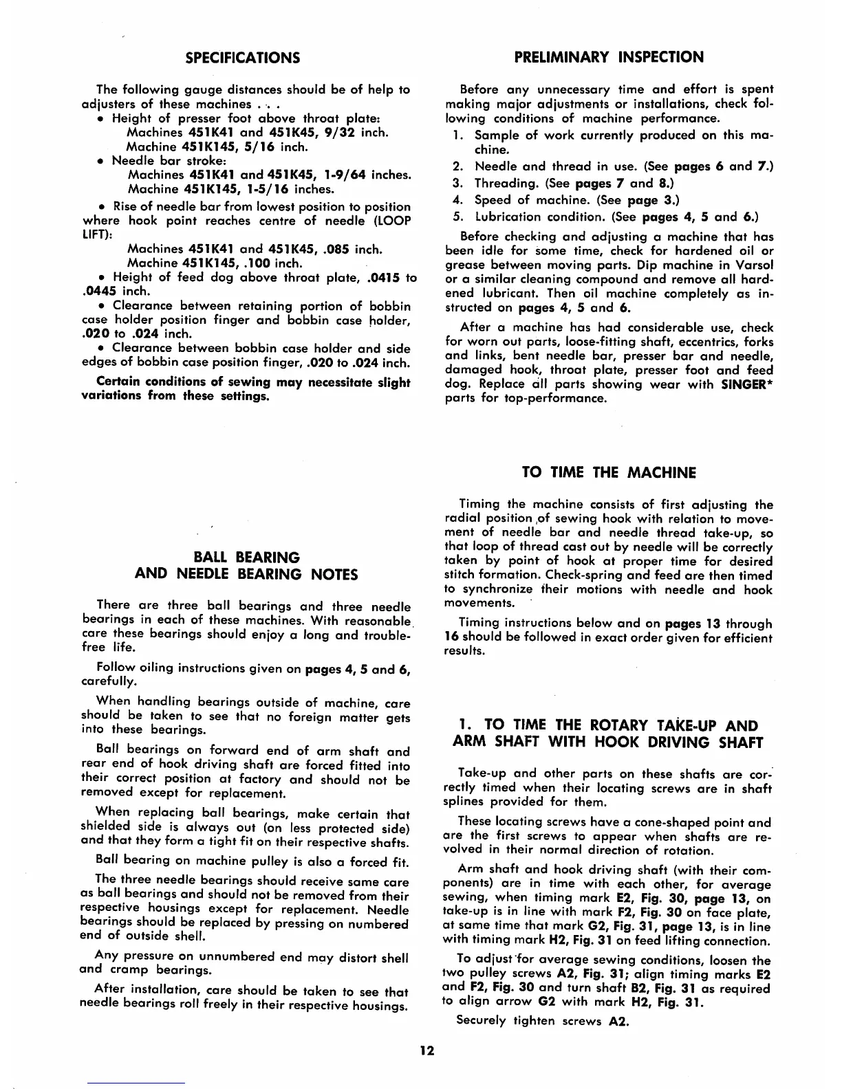 Singer 451k45 - SPECIFICATIONS; PRELIMINARY INSPECTION; TO TIME THE MACHINE
