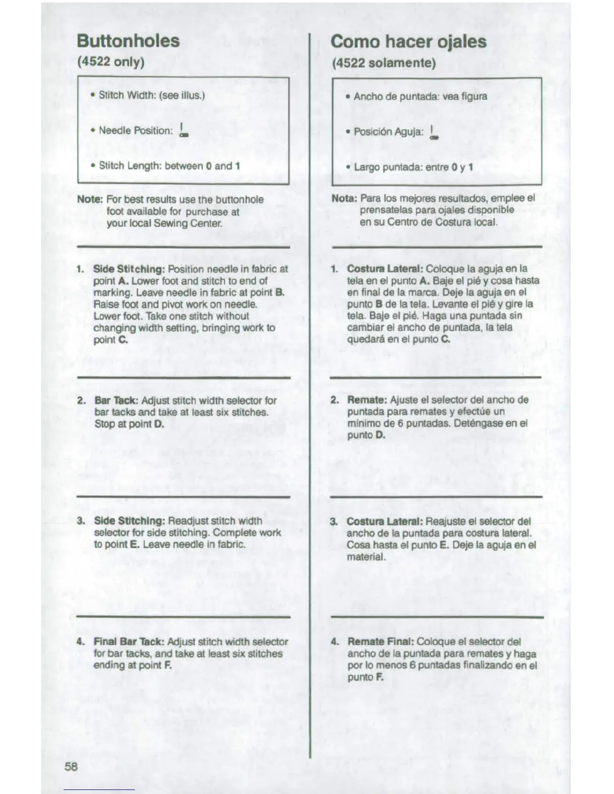 Singer 4522 - Buttonholes (4522 only); Side Stitching and Bar Tacks