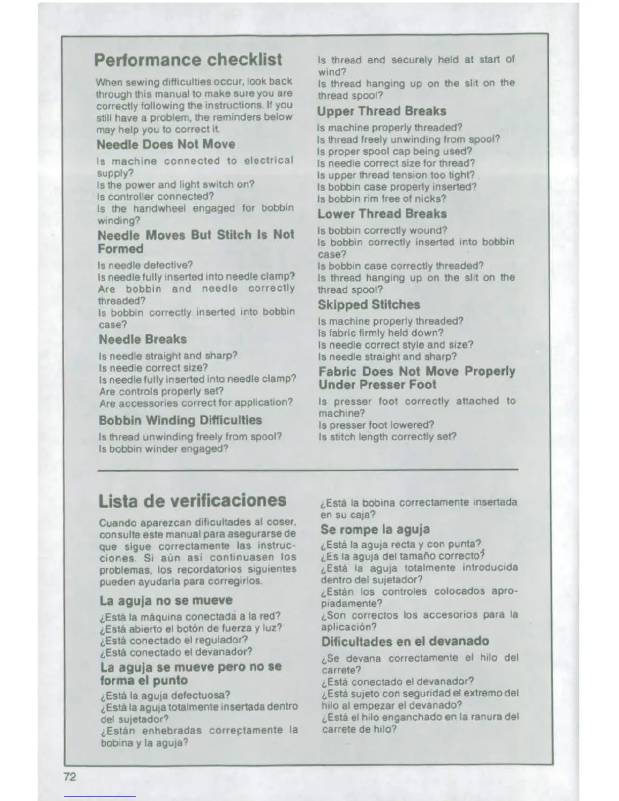 Singer 4522 - Performance Checklist; Troubleshooting Guide