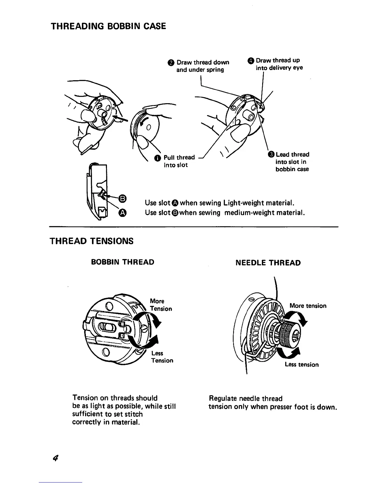 Singer 457u105 - BOBBIN CASE THREADING; Bobbin Thread Path Guide; Slot Selection for Material; THREAD TENSION ADJUSTMENT
