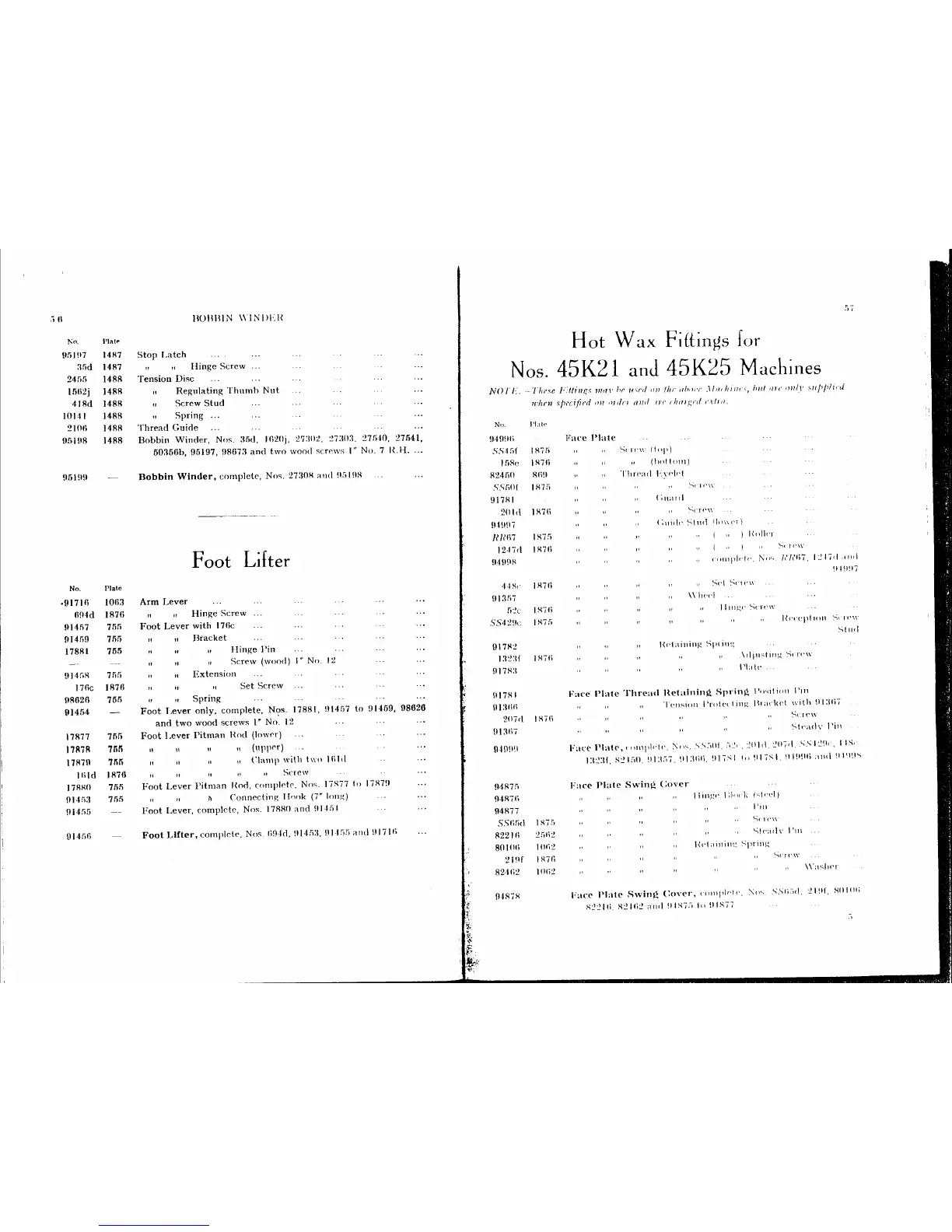 Singer 45K21 - Foot Lifter; Hot Wax Fittings for Nos. 45 K21 and 45 K25 Machines