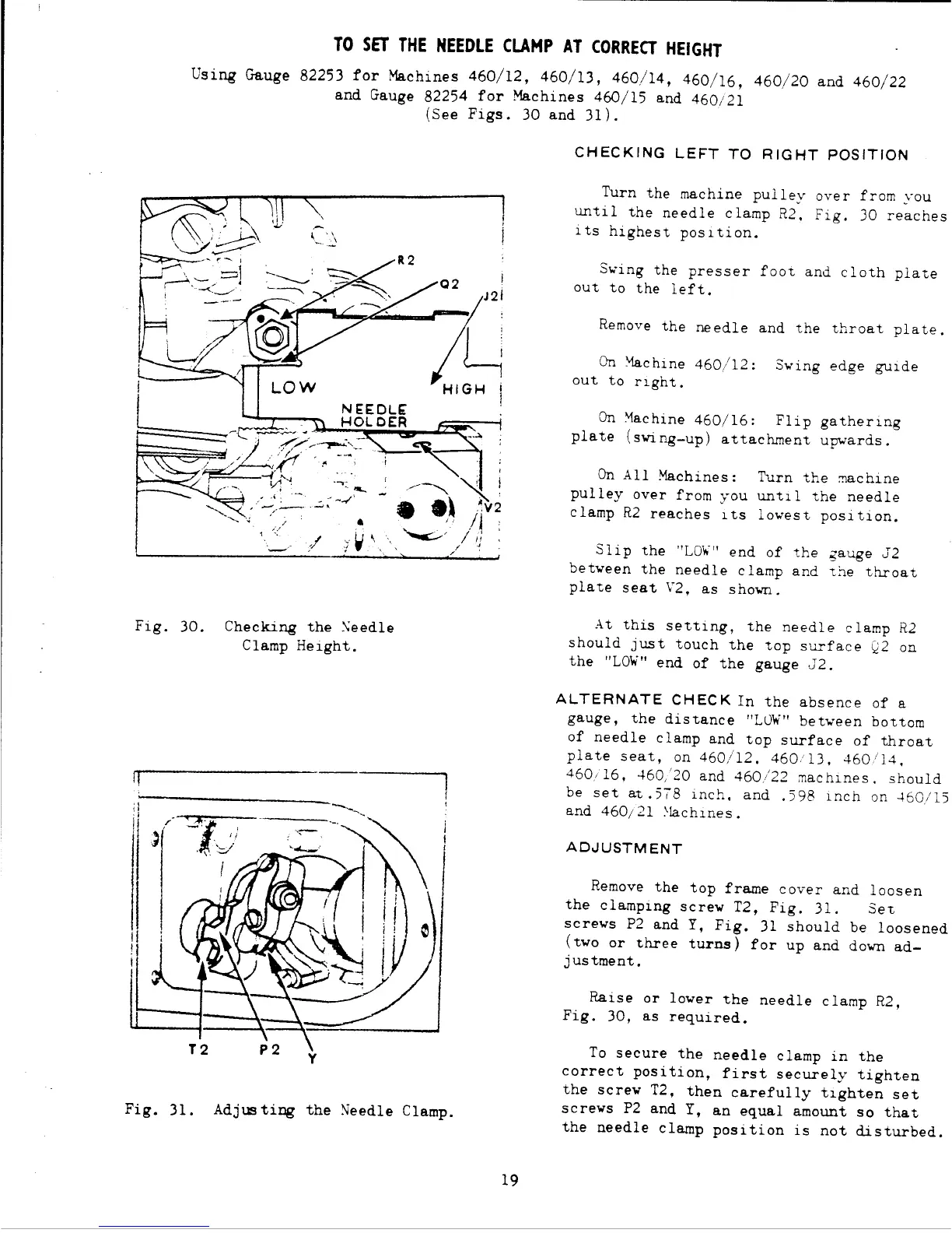 Singer 460 CLASS - TO SET THE NEEDLE CLAMP AT CORRECT HEIGHT; CHECKING LEFT TO RIGHT POSITION; ADJUSTMENT