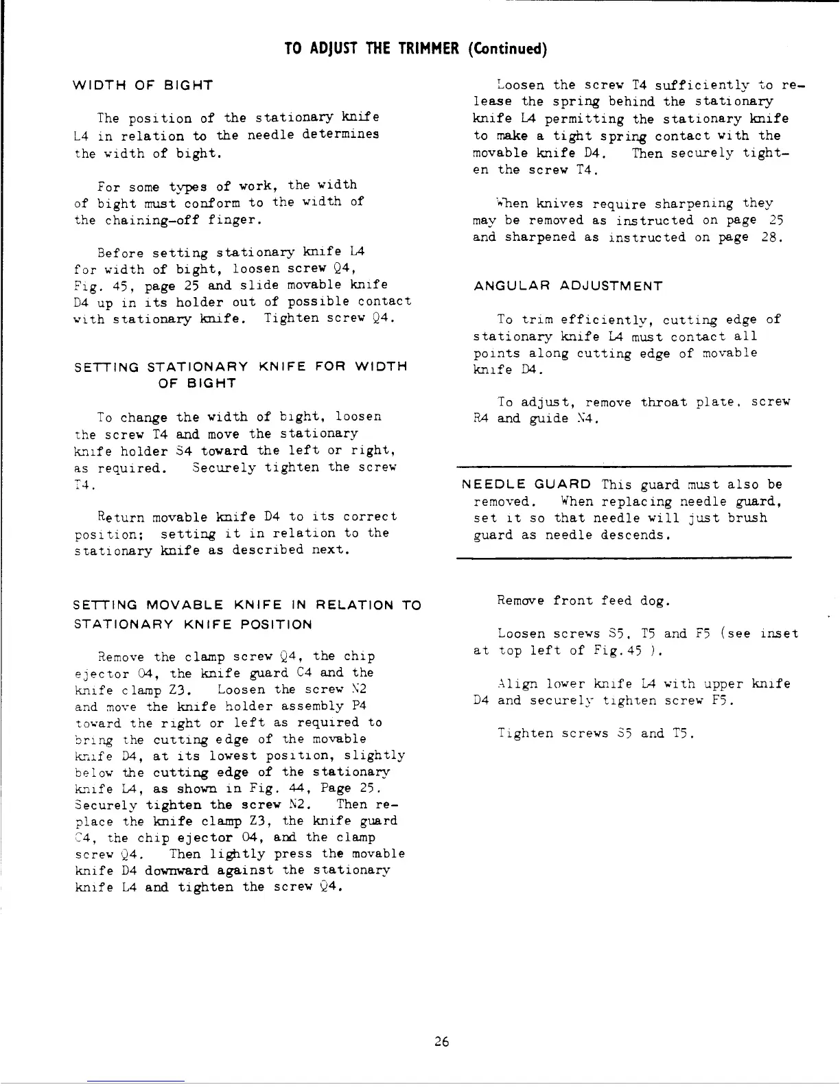 Singer 460 CLASS - TO ADJUST THE TRIMMER; WIDTH OF BIGHT; SETTING MOVABLE KNIFE IN RELATION TO STATIONARY KNIFE POSITION