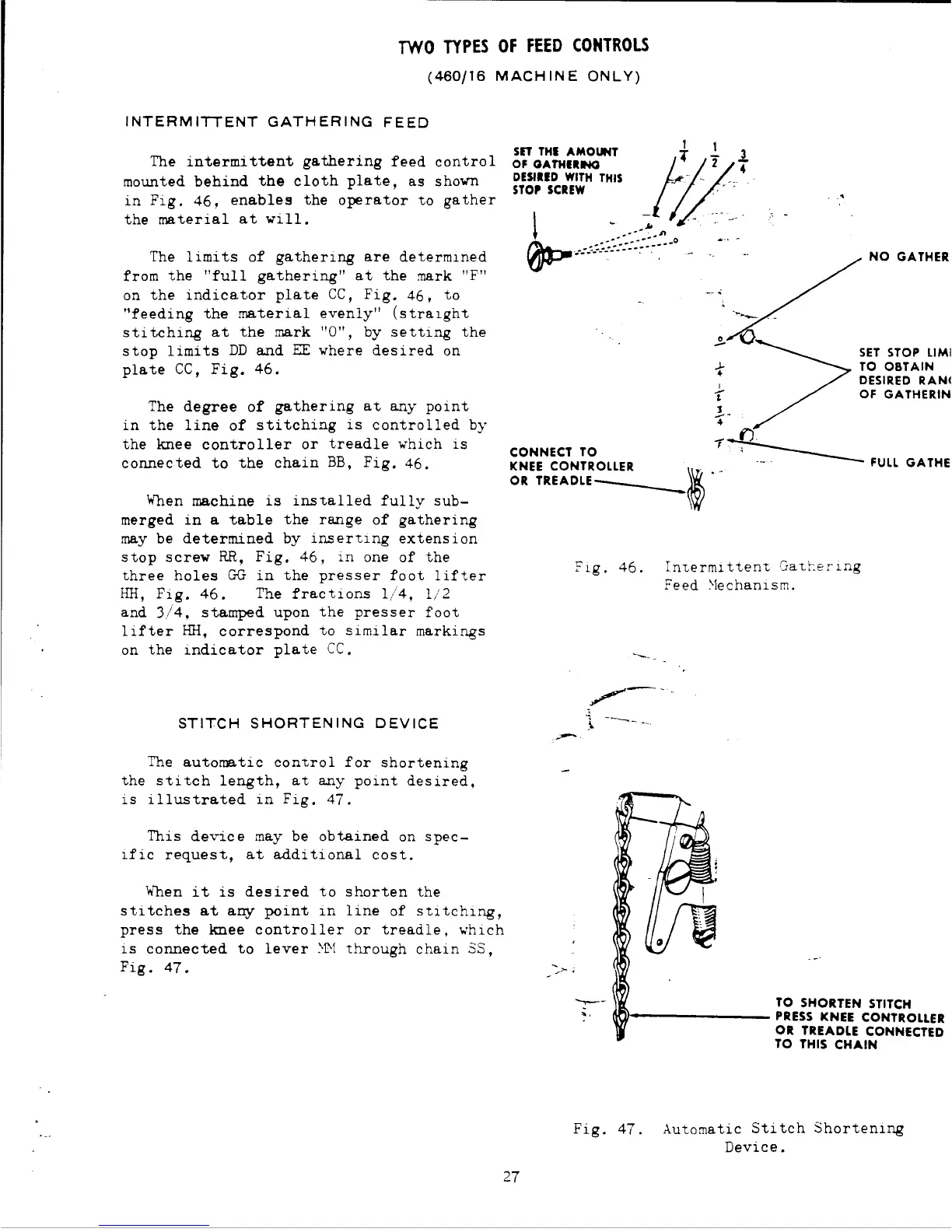 Singer 460 CLASS - TWO TYPES OF FEED CONTROLS; INTERMITTENT GATHERING FEED; STITCH SHORTENING DEVICE