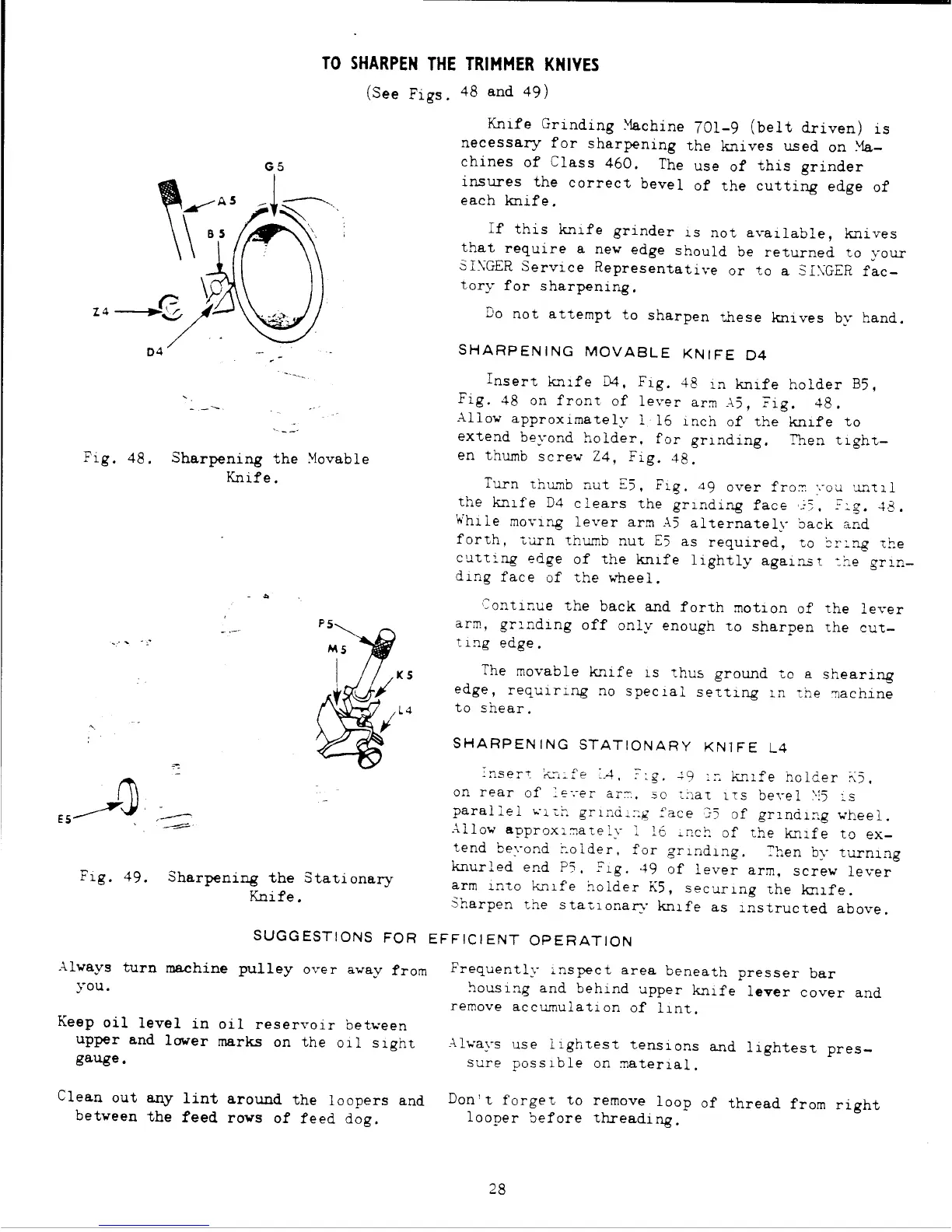 Singer 460 CLASS - TO SHARPEN THE TRIMMER KNIVES; SHARPENING MOVABLE KNIFE D4; SUGGESTIONS FOR EFFICIENT OPERATION