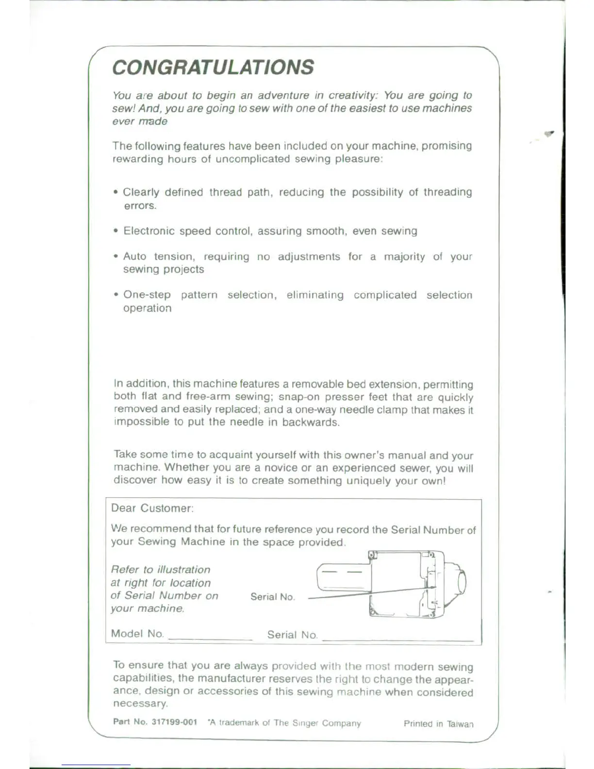 Singer 4671 - Welcome and Machine Introduction; Key Machine Features; Customer Serial Number Recording