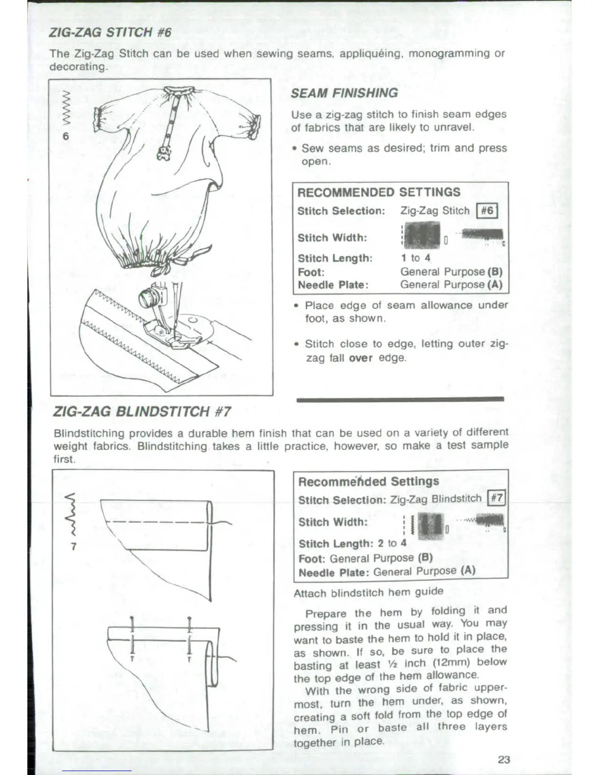Singer 4671 - Zig-Zag Stitch (Pattern #6); Zig-Zag for Seam Finishing; Recommended Settings for Zig-Zag; Zig-Zag Blindstitch (Pattern #7)