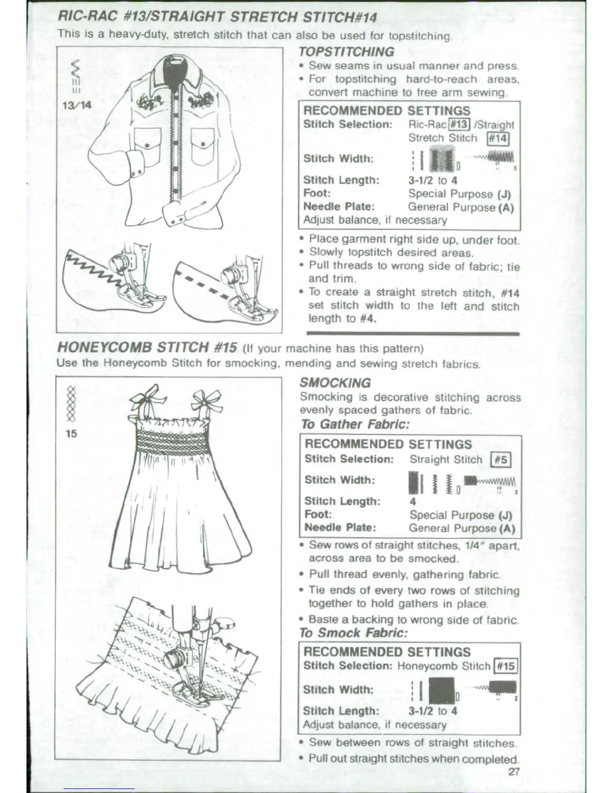 Singer 4671 - Ric-Rac;Straight Stretch Stitches (Patterns #13;#14); Topstitching with Ric-Rac;Straight Stretch; Recommended Settings for Ric-Rac;Stretch Stitch; Honeycomb Stitch (Pattern #15)