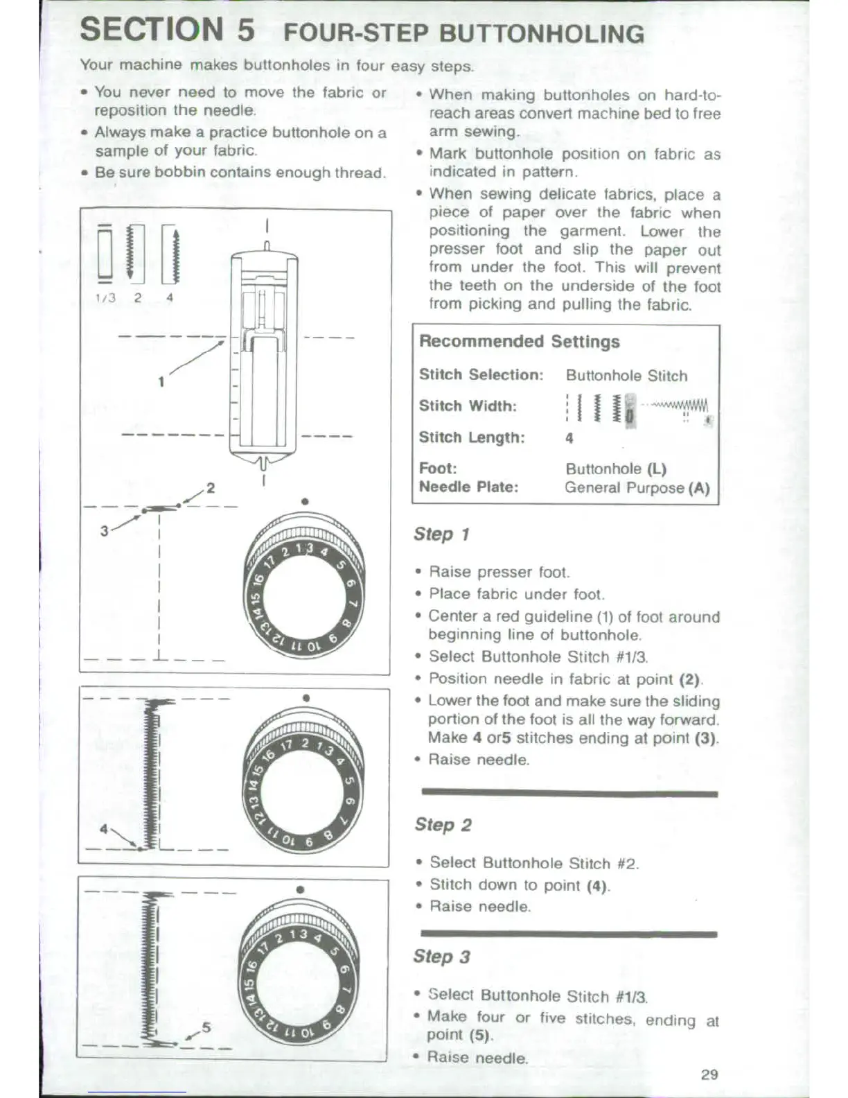 Singer 4671 - Four-Step Buttonholing; Buttonholing on Difficult Areas; Sewing Delicate Fabrics for Buttonholes; Recommended Buttonhole Settings