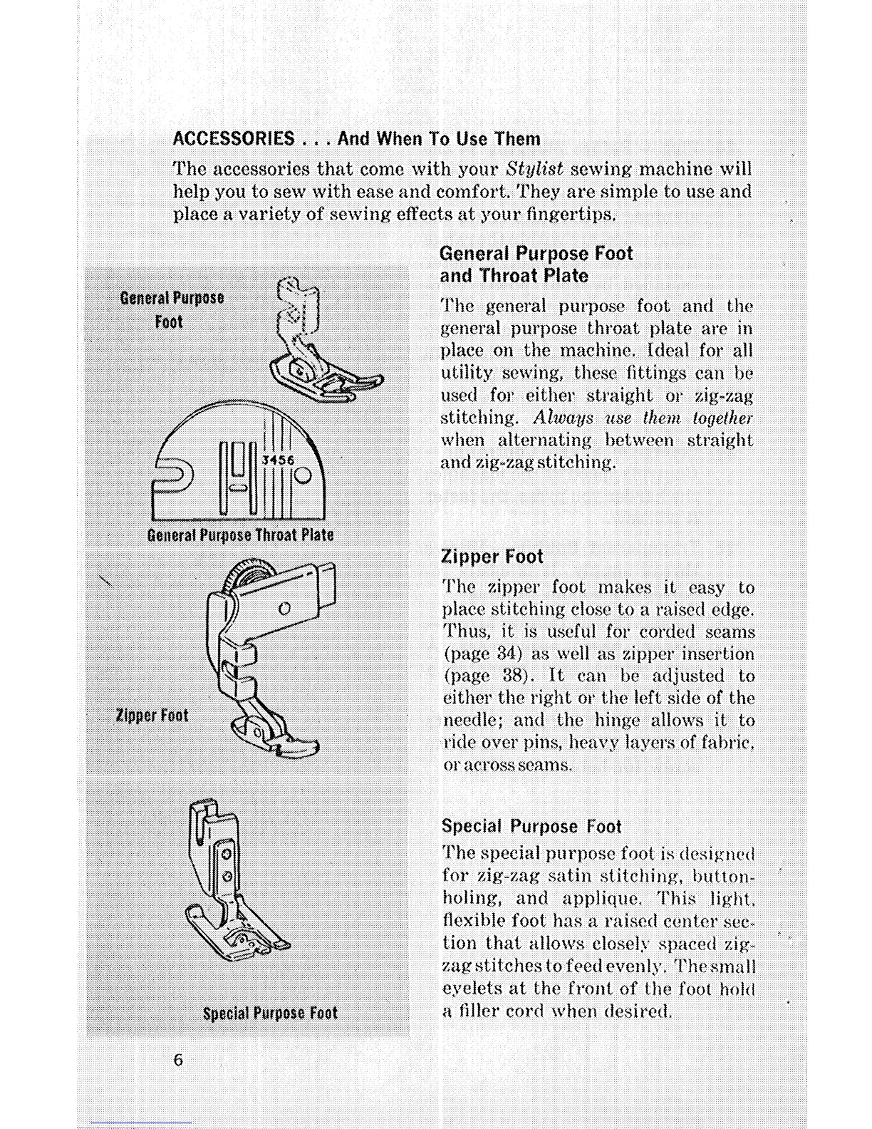Singer 477 - Accessories; General Purpose Foot and Throat Plate; Zipper Foot; Special Purpose Foot