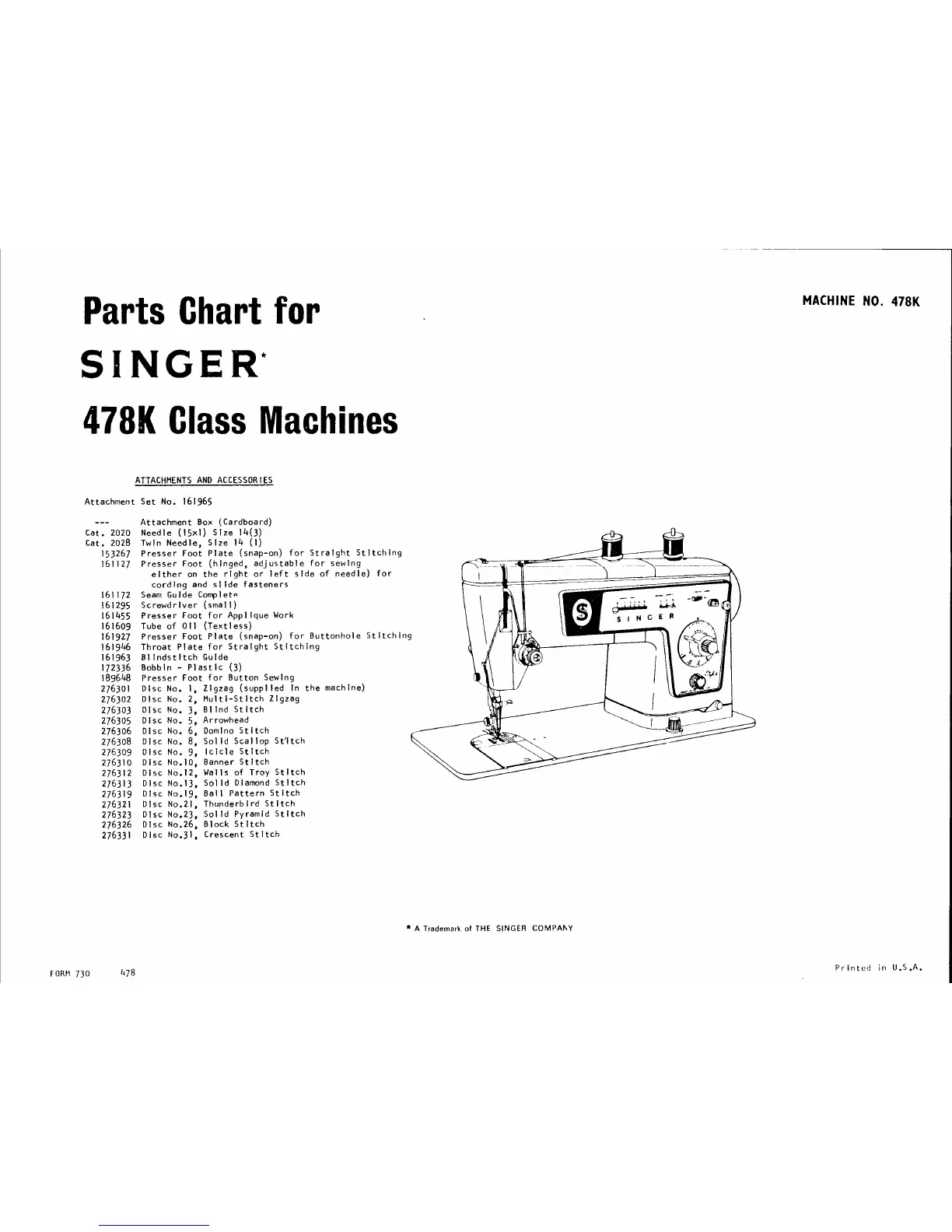 Singer 478K - Singer 478 K Class Machines Parts Chart; Attachments and Accessories List