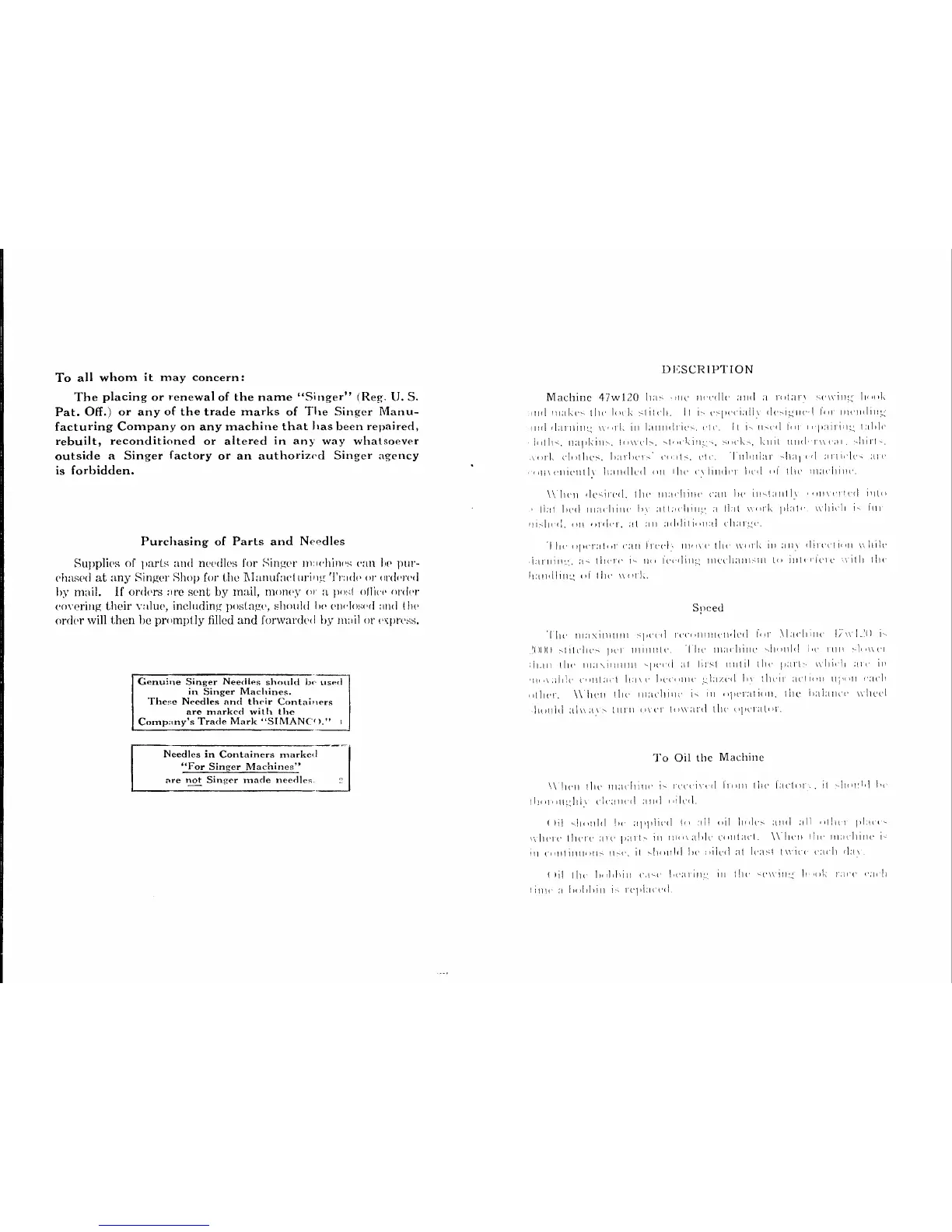 Singer 47W120 - Description; Speed; To Oil the Machine