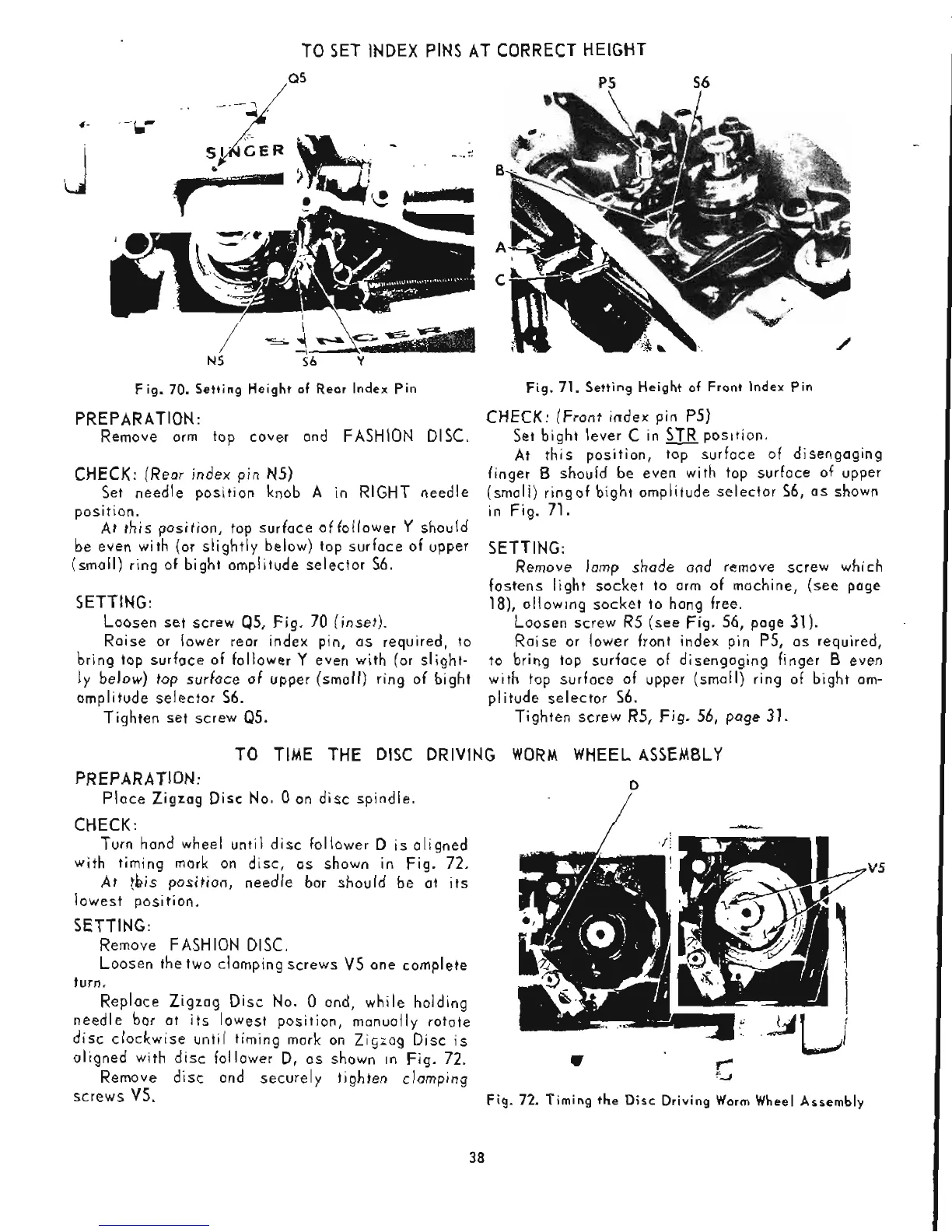 Singer 500 - Setting Index Pins at Correct Height; Setting Height of Rear Index Pin; Setting Height of Front Index Pin; Timing Disc Driving Worm Wheel Assembly