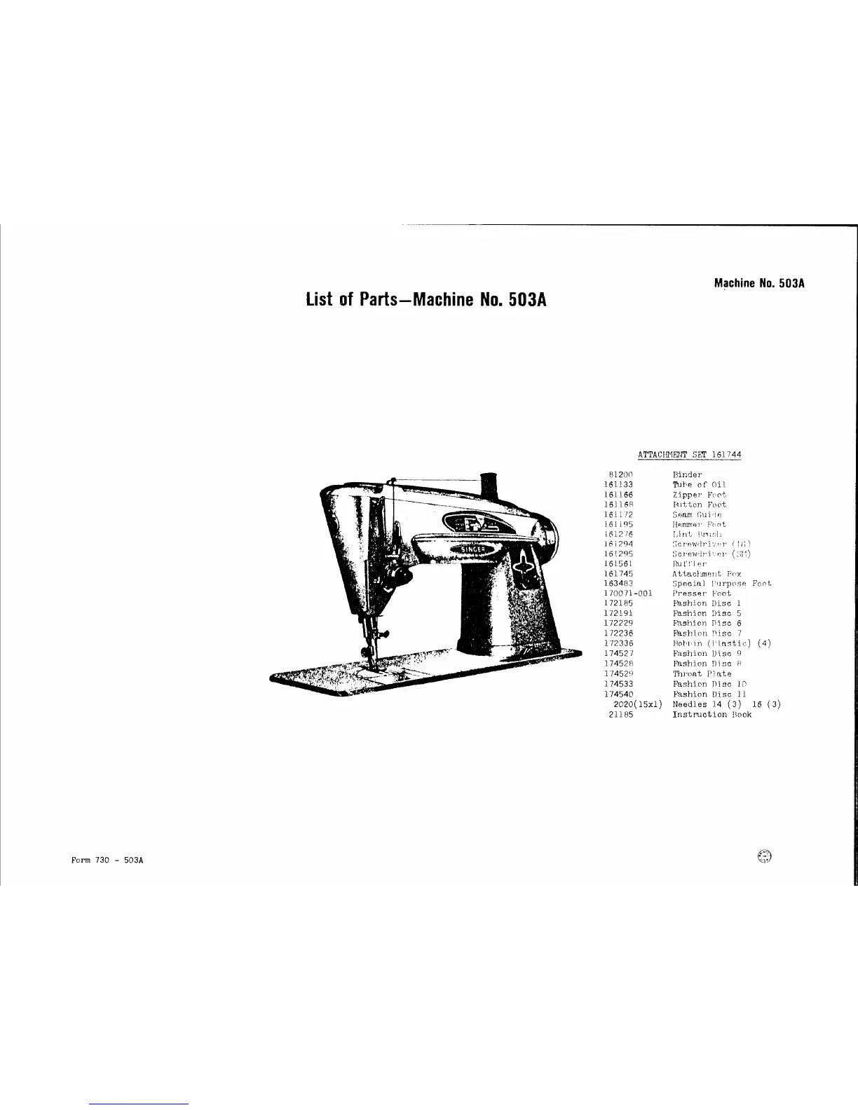 Singer 503A - List of Parts; Attachment Set