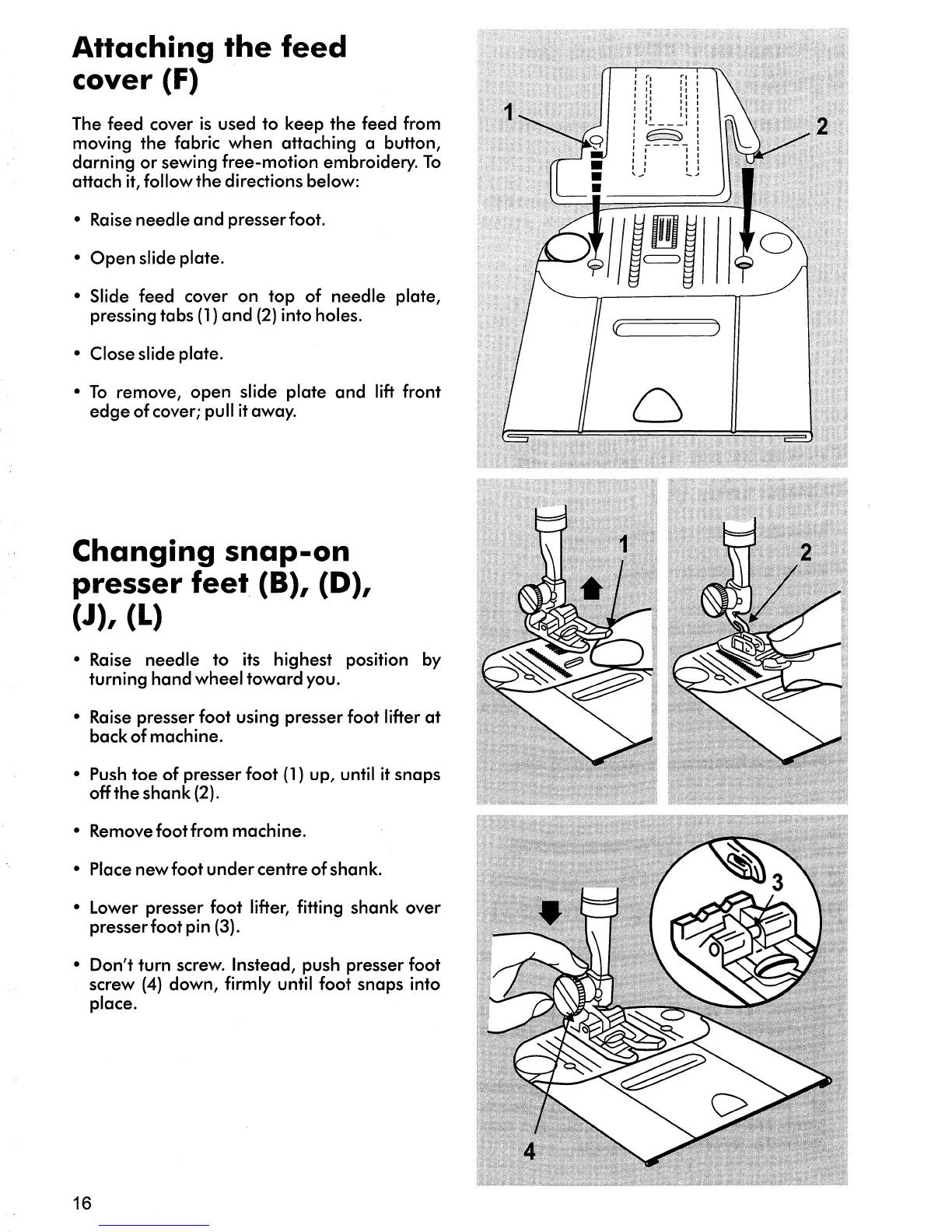Singer 5062 - Attaching the feed cover (F); Changing snap-on presser feet