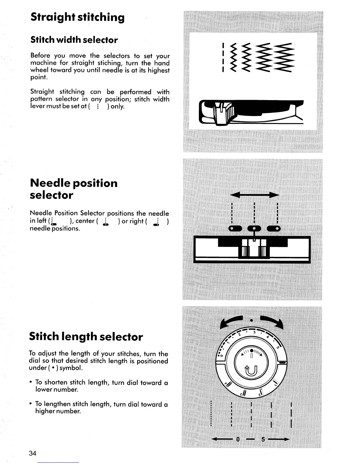 Singer 5062 - Straight stitching; Stitch width selector; Needle position selector; Stitch length selector