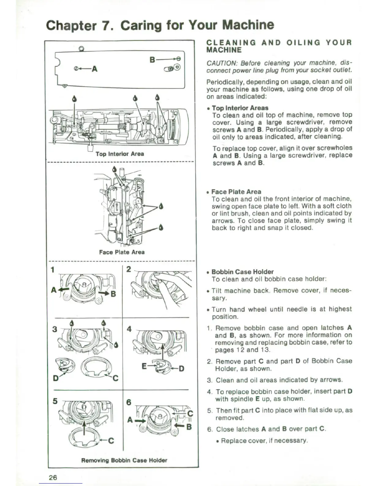 Singer 5102 - Chapter 7. Caring for Your Machine; Cleaning and Oiling Your Machine; Top Interior Areas; Face Plate Area