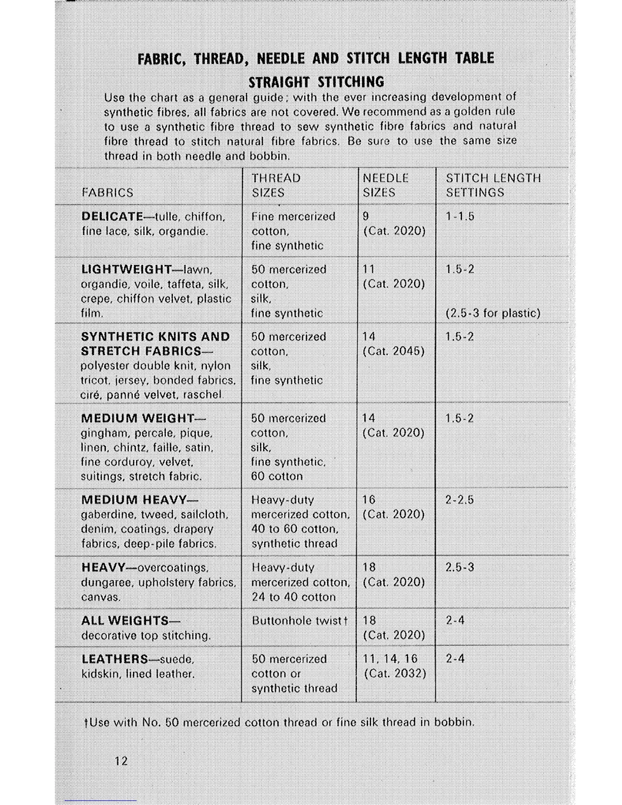 Singer 514 - Fabric, Thread, Needle, and Stitch Length Table