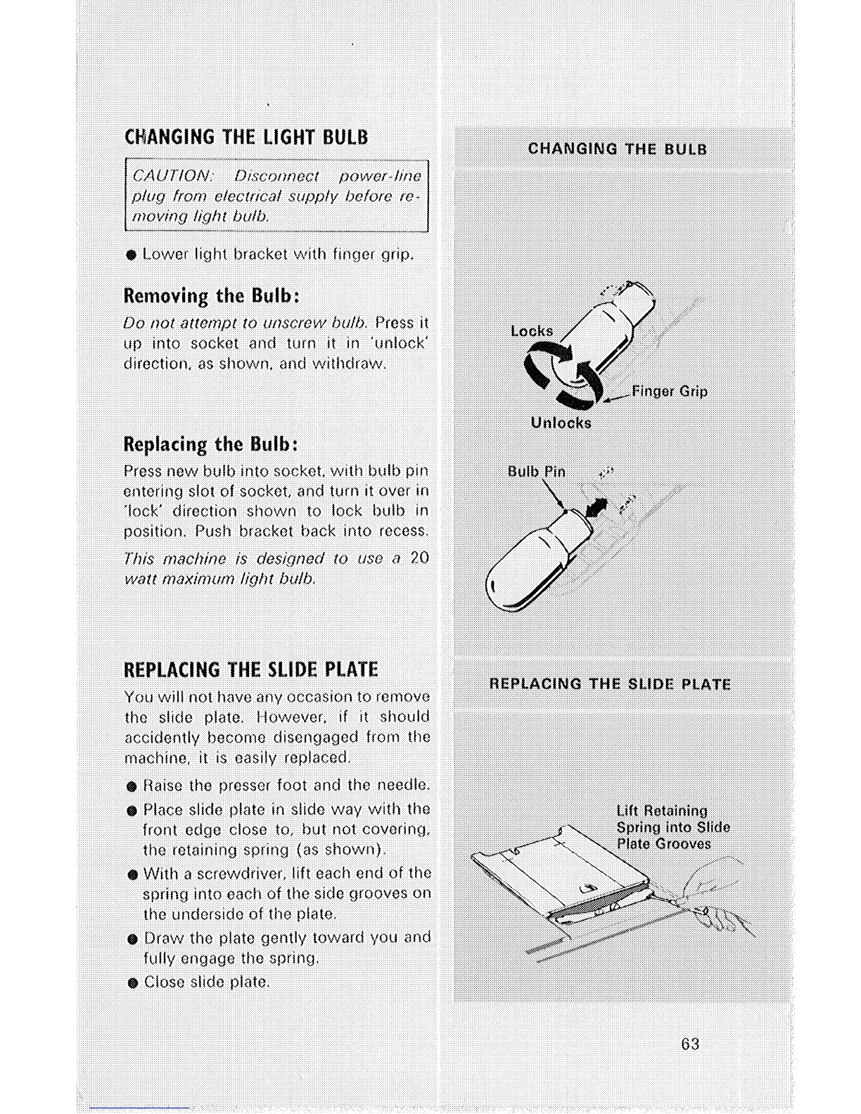 Singer 514 - Changing Light Bulb; Removing the Bulb; Replacing the Bulb; Replacing the Slide Plate