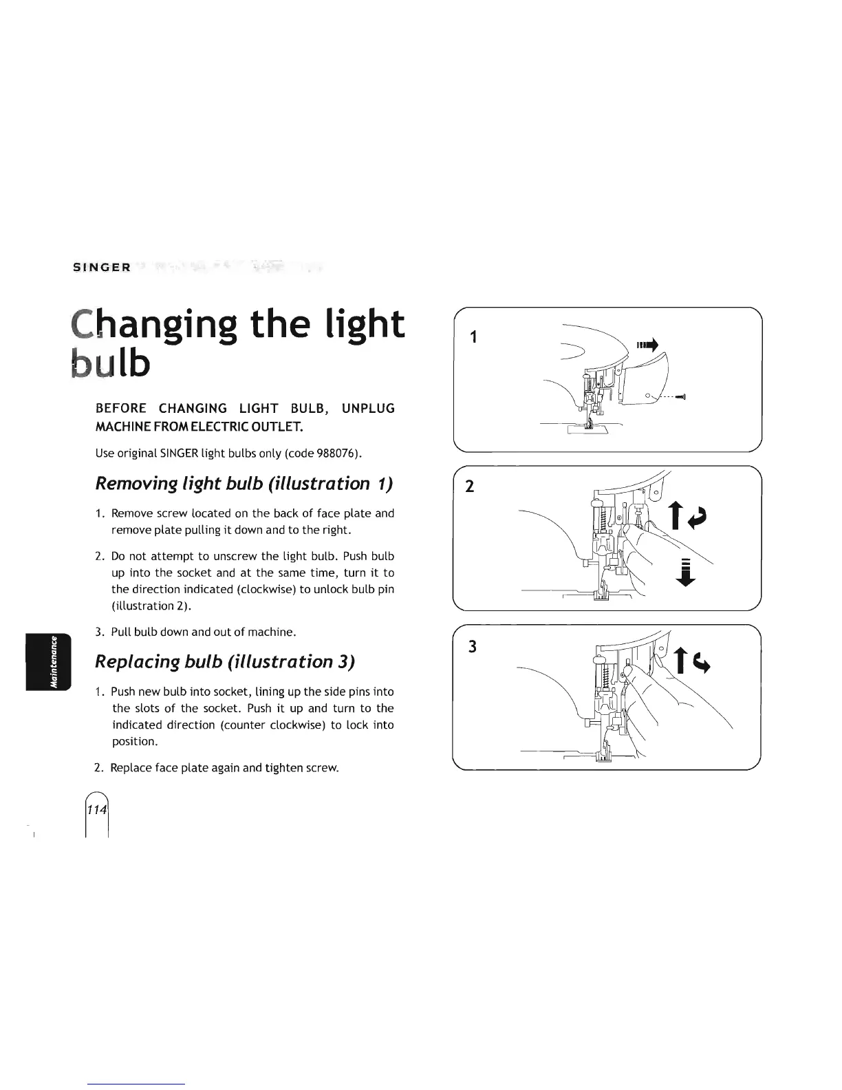 Singer 5160 - Changing the Light Bulb; Removing Light Bulb; Replacing Bulb